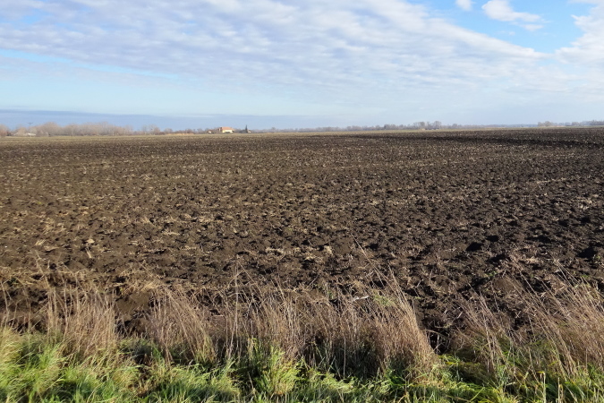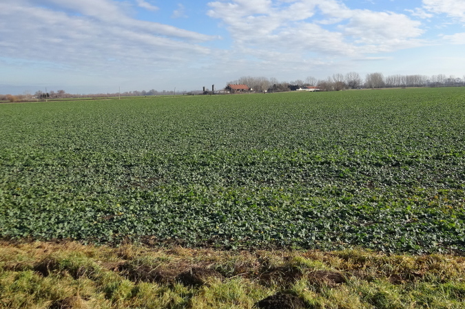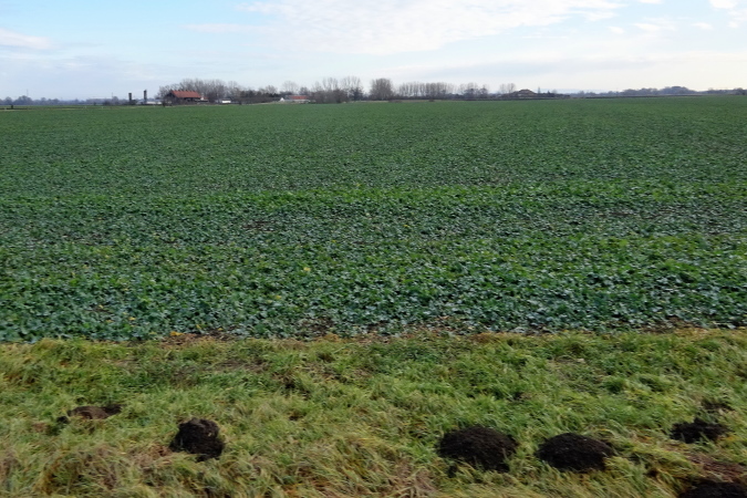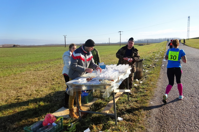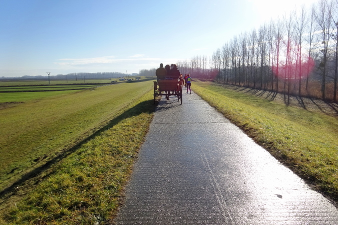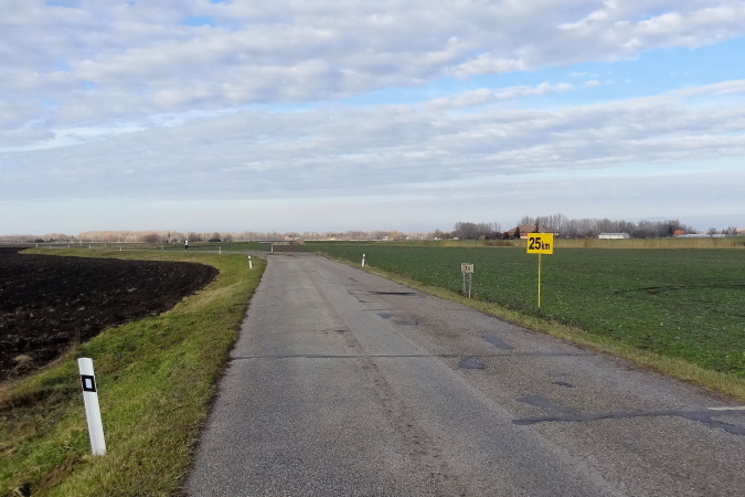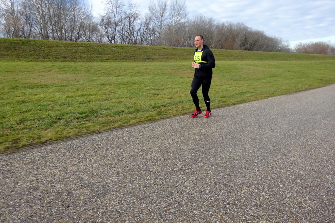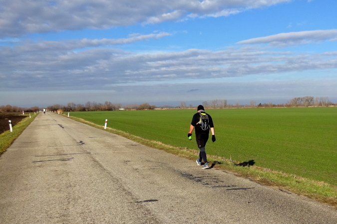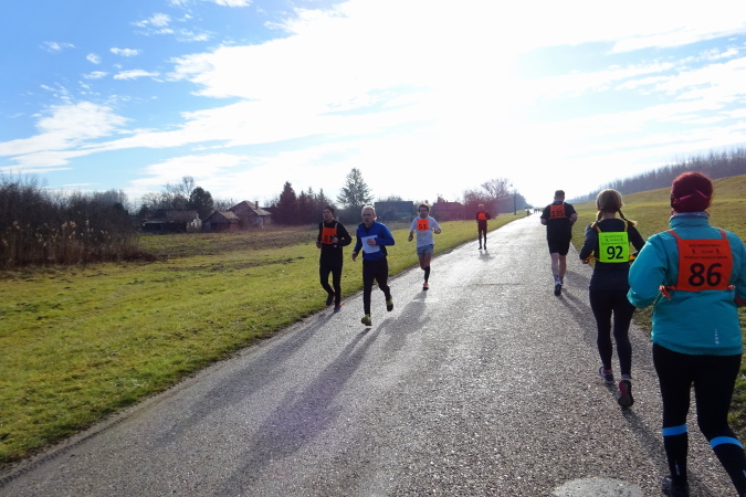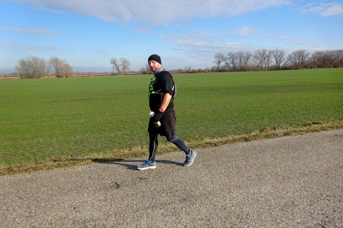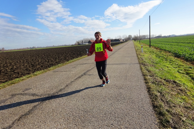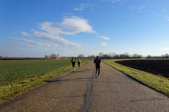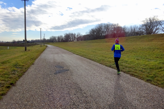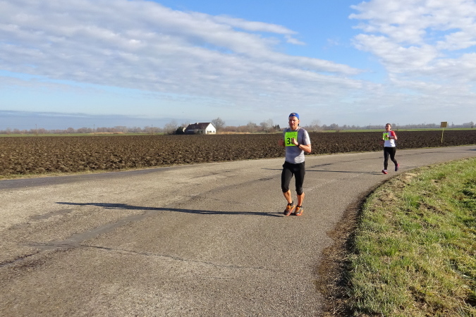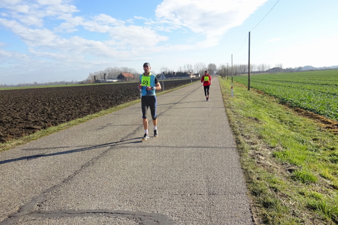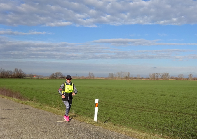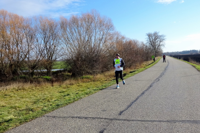 In mehreren langgezogenen Richtungswechseln führt der ebene Marathonkurs auf einer Asphaltstraße entlang einer kultivierten Agrarlandschaft mit teilweise brach liegenden, umgepflügten Äckern sowie vorbei an Feldern mit aufgegangener Wintersaat. Wenn einer in Form ist, könnte er heute eine gute Laufzeit schaffen – fast 10 Grad Lufttemperatur, trocken, windstill, besser geht es ja gar nicht. Warum ist für mich nicht mehr drin? Weil mein Vorsatz für 2018 erneut nicht lautet, eine schnelle Zeit zu erzielen, sondern die Anzahl der Marathons und die Länderanzahl auszuweiten.