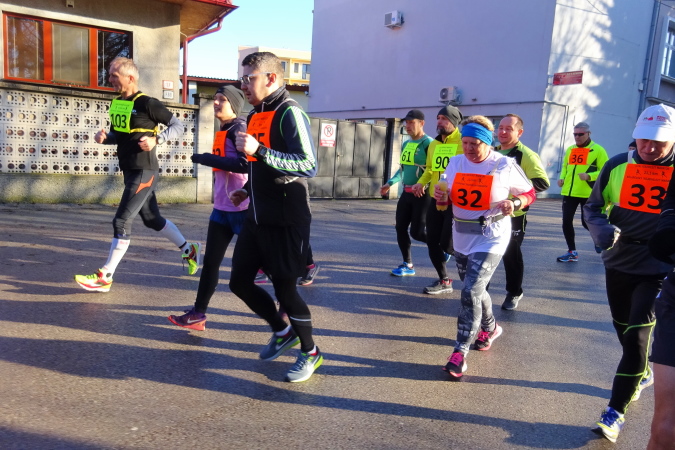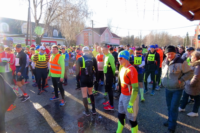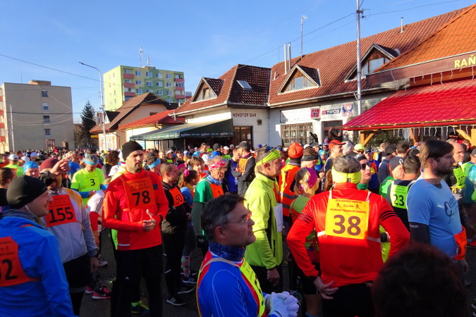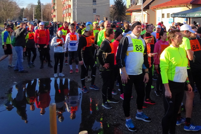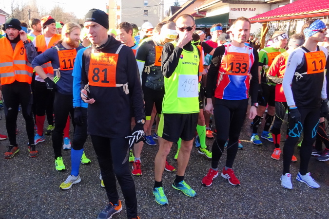Der Start- und Zielbereich ist ca. 100 m vom Gemeindeamt entfernt, nahe dem örtlichen Postamt, das heute an diesem streng kirchlichen Feiertag wie alle Geschäfte in der Slowakei – auch die großen Einkaufszentren – geschlossen ist. Die tiefstehende Sonne erschwert das Fotografieren. Aber die Minusgrade fehlen uns Läufern heute überhaupt nicht, selbst meine drei Lagen hätte ich mir wie die Handschuhe sparen können.