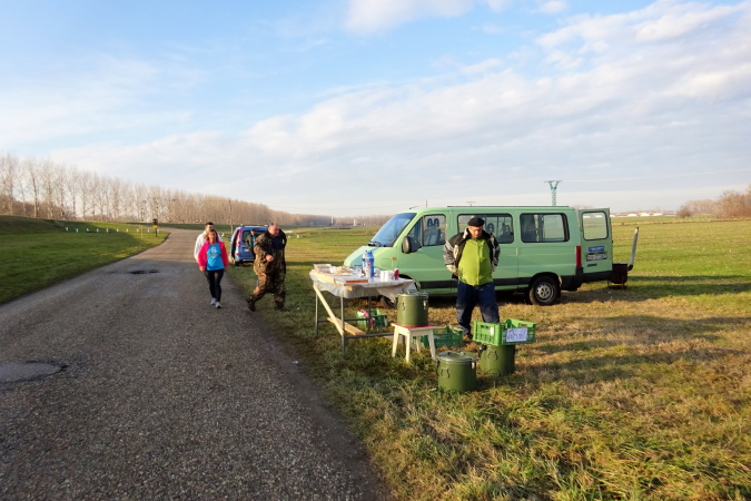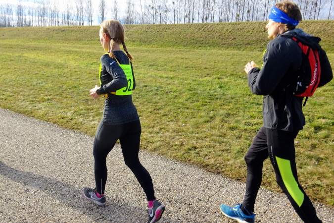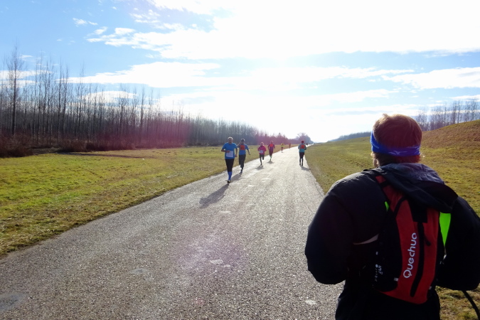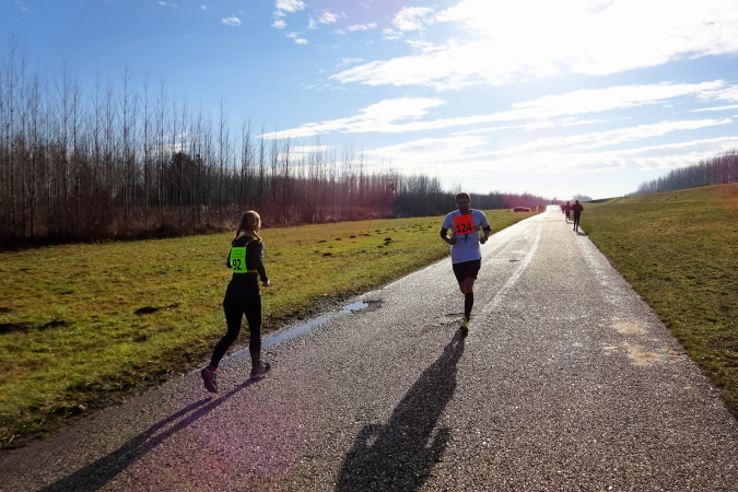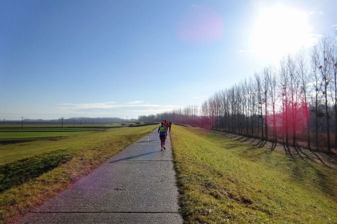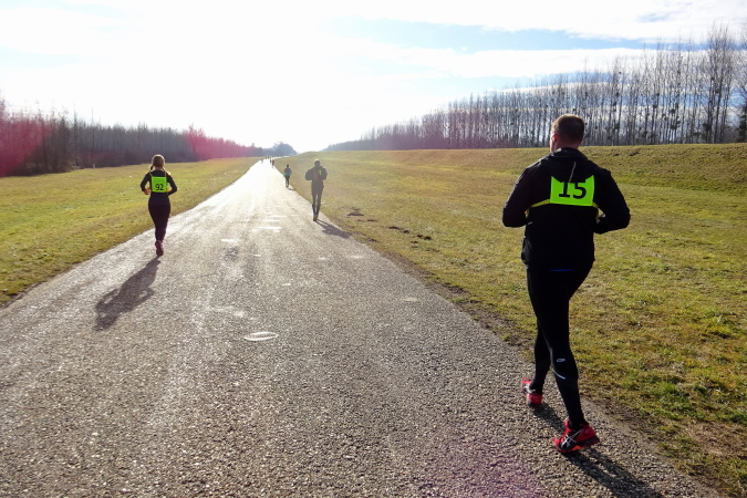Wir erreichen die 10 km-Labestation, es gibt warmen Tee, Cola, Mineralwasser, auch Schokostücke und Kekse. Eva versucht davonzueilen, ich hole sie wieder ein. Doch ich merke, dass für mich ein reines Sechsertempo heute zu hoch sein wird. Sie meint noch, dass bei der Wende nach ca. 23,5 km der Rückweg wegen des Gefälles, auf dem wir nach Süden laufen, etwas schwieriger werden wird, aber ich würde das schon selbst merken. Inzwischen kommen uns die schnellen Halbmarathonläuferinnen und -läufer entgegen, die irgendwo da vorne umgedreht haben. Die Sonne steht tief, im Gegenlicht sind die Konturen kaum erkennbar.