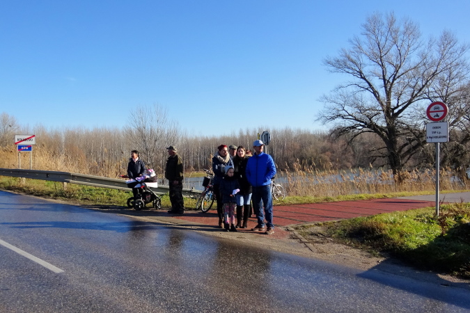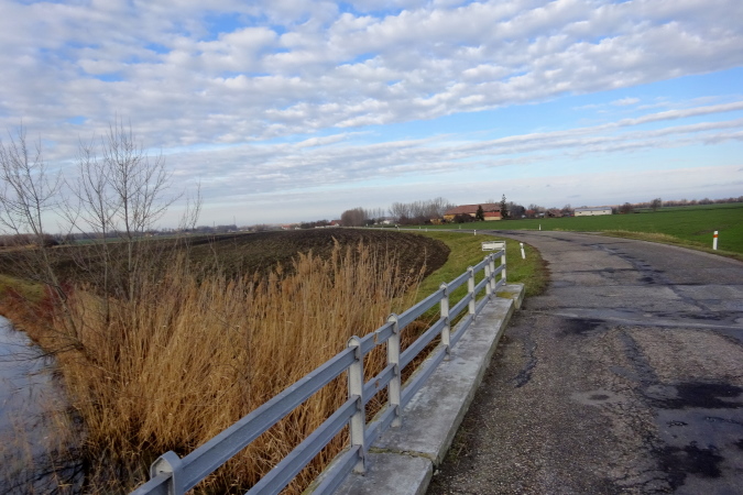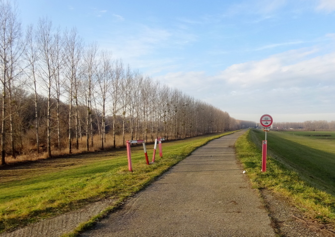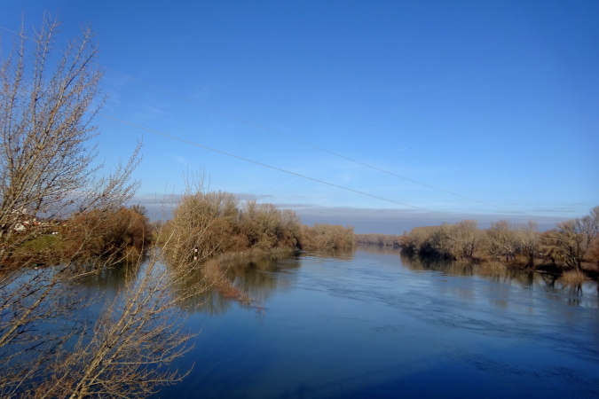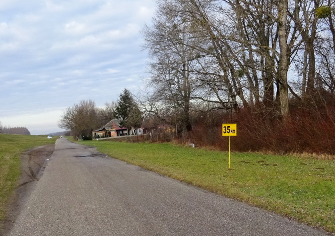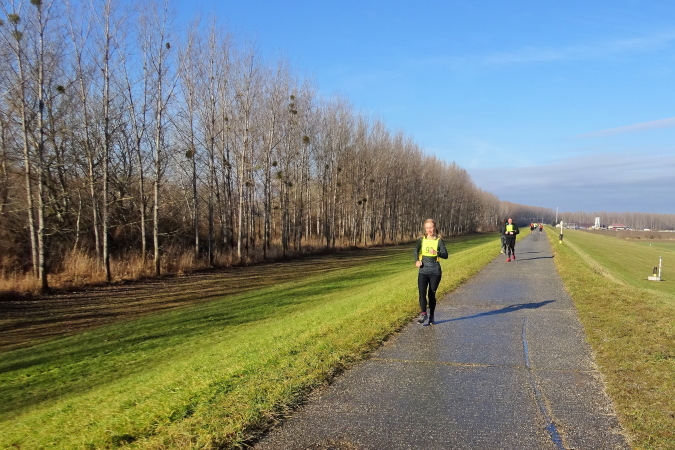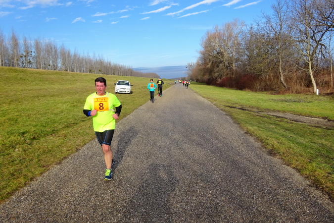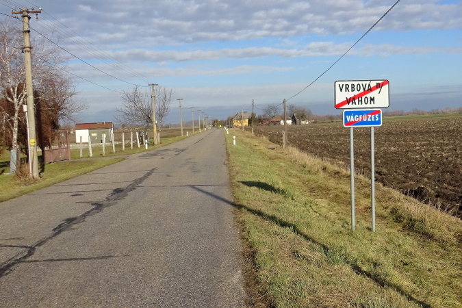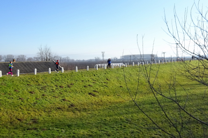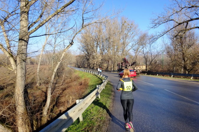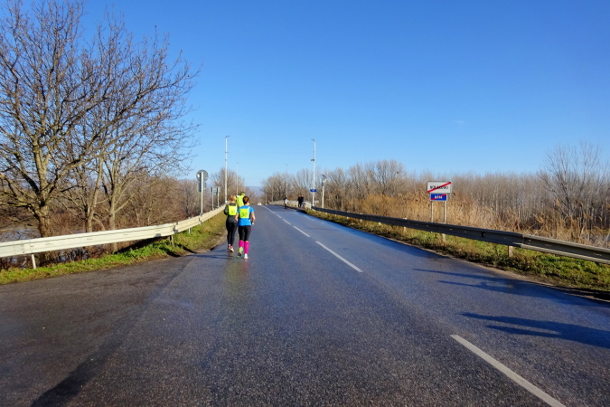 Wir laufen nun in nordöstliche Richtung stadtauswärts, manchmal kommt ein Auto nach. So schön wie heute war das Wetter hier am Heiligen Dreikönigstag noch nie, daher wird dieser Marathon für mich zum Erlebnis und die Möglichkeit bieten, einen weiten Blick bei Sonnenschein in die Landschaft zu werfen. Wir erreichen die Brücke über den Fluss Waag, der mit ca. 400 km nach Donau und Theiß der längste Fluss des Karpatenbeckens ist und bei Komárno in die Donau mündet. Der Marathonkurs wird nun einige Kilometer in südliche Richtung am Damm entlang führen.
