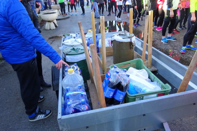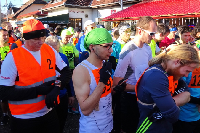 Der Andrang zum Lauf ist heute im Vergleich zu den Jahren davor – zweimal war ich schon hier – so groß wie nie, das schöne Winterwetter ohne Schnee macht Freude auf den ersten Marathon im neuen Jahr. Ich bin registriert, die 10 Euro habe ich rechtzeitig per Banktransfer überwiesen. Die  über den Schulter- und Brustbereich anzulegende Startnummer aus Stoff mit Bändern zum seitlichen Zusammenknoten, die so meine zugeteilte Nummer 29 von vorne und hinten erkennen lässt, hat die Grundfarbe Gelb – die Halbmarathonläufer bekommen eine orange unterlegte. Im Gemeindesaal stehen schon die Pokale für die späteren Sieger und hinter einer Absperrung sind die per Gutscheinbon zu konsumierenden Essenvorräte – Würstchen, Senftuben, Brotwecken, Cola und Bierdosen  – noch in Schachteln verpackt, sichtbar.