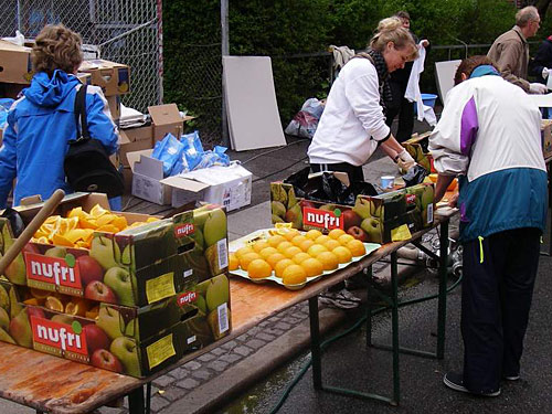 Verpflegungspunkte alle vier Kilometer: Iso, Wasser, Power Bar Gel, Äpfel und Bananen; im Ziel: Freibier, Obst, Riegel, warmer Kakao mit Brot, Jogurt