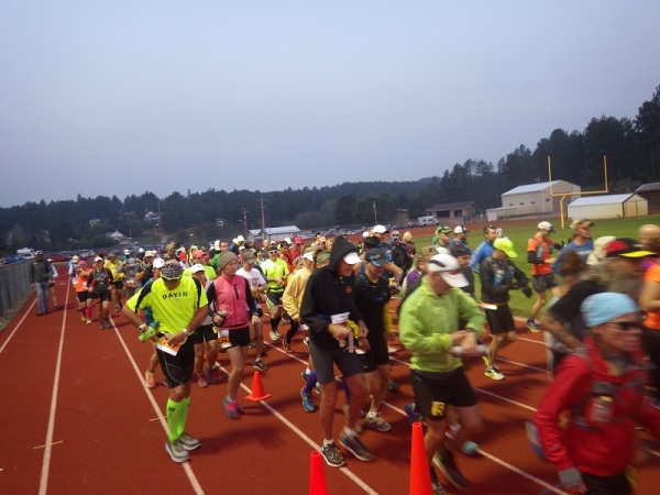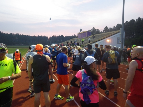 Doch nun zum eigentlichen Lauf. Anmeldung war Freitagabend im örtlichen YMCA. Nach dem Erhalt der Startnummer und des T-Shirts konnten wir unsere 4 Dropbags (Materialtaschen) abgeben, damit sie an zentralen Stellen an der Strecke deponiert werden. Um 18 Uhr erfolgte dann das obligatorische Race Briefing, in dem der Rennverantwortliche Royce Wurtzer uns die Strecke näher brachte und auf Besonderheiten hinwies. Dann noch der nette Gedankenaustausch mit den anderen 100 Meilern. Viele von denen kannte ich schon von anderen gemeinsamen Läufen. Dann noch schnell noch was Essen (Pizza) und ab ins Bett, denn am nächsten Morgen um 4 Uhr (Jetlag lässt grüßen) ging es schon wieder raus.