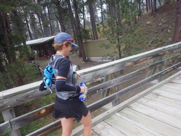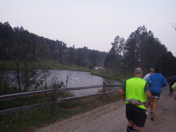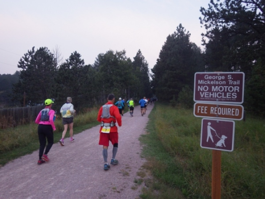 Naja, war ja für alle Läufer gleich dachte ich, aber hart war es schon. Custer liegt übrigens auf 1.600 müNN, also wirklich in den Bergen. Pünktlich um 6 Uhr ging es dann los und nach 1 Stadionrunde ging es direkt auf den Trail. Die ersten 8 Km ging es nur bergauf, bis zum Crazy Horse Memorial. Der Wind machte uns hier schon zu schaffen, sollte aber im Verlauf des Tages noch heftiger werden. Wir merkten dies spätestens an den umstürzenden Bäumen. Die erste Verpflegungsstelle hatte wir an der Schutzhütte Orwille nach 16 km erreicht. Dort erwarteten uns auch warme Getränke, die wir gerne in Anspruch nahmen, auch wenn die Temperaturen mittlerweile auf 12 Grad angestiegen waren.
