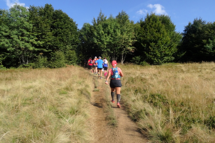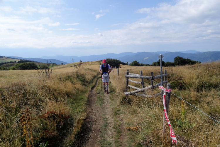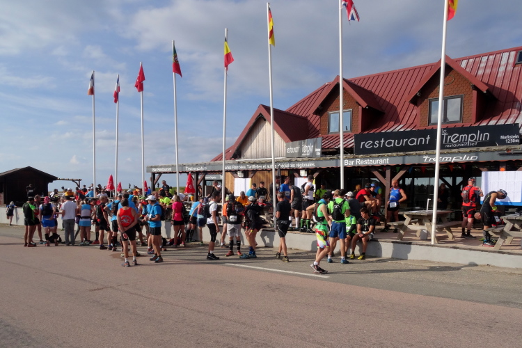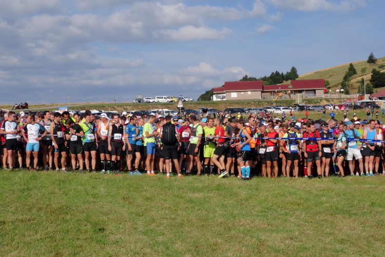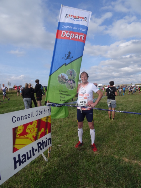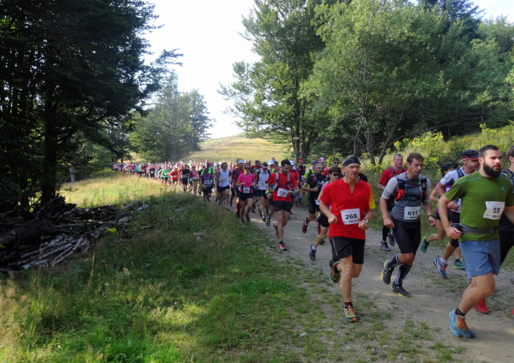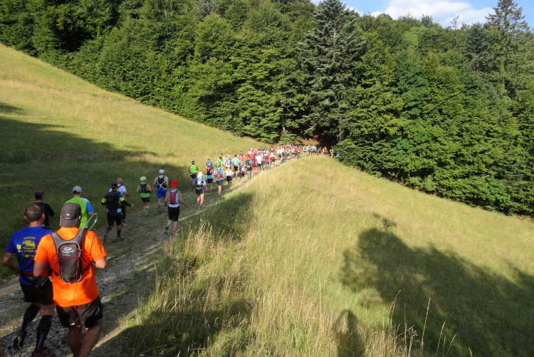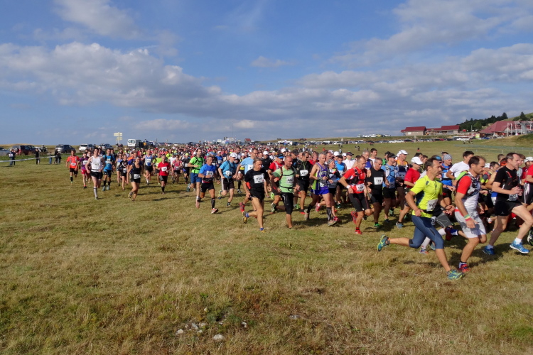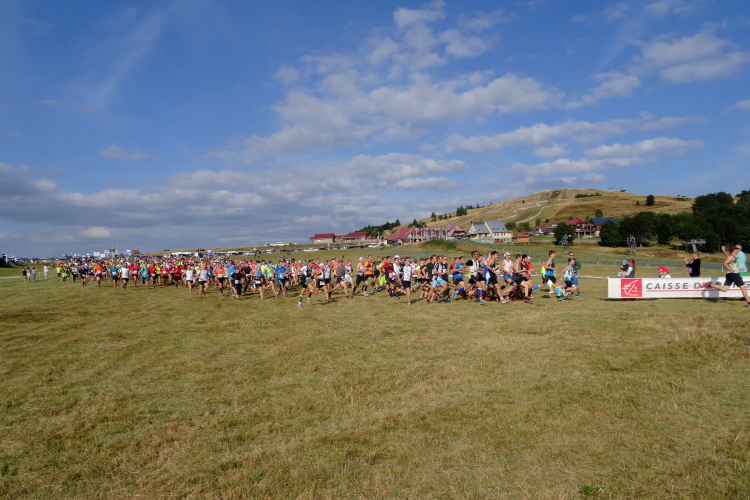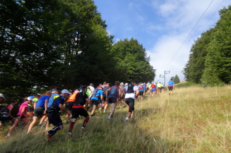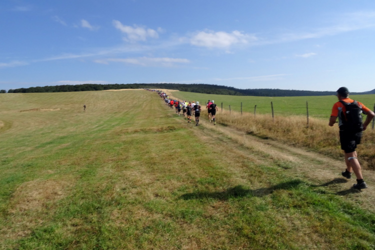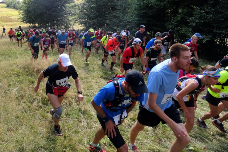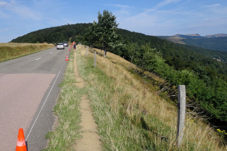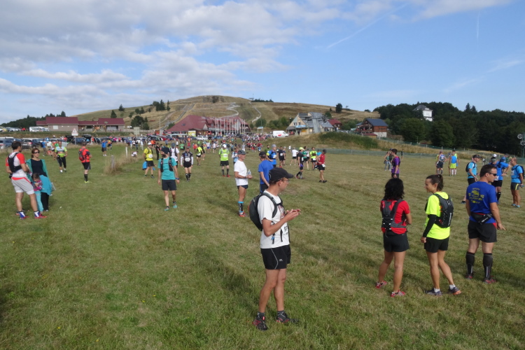 Um 9:30 Uhr geht dann die Reise über den Vogesenkamm los. Auf den ersten 500 Metern haben wir Trailer noch Zeit, um uns im Läuferfeld einzuordnen, denn wenig später geht es bergan über einen Wiesenweg, unter einer Sessellifttrasse, wo es unweigerlich zum Stau kommt. Nach diesem ersten heftigen Anstieg geht es im Anschluss über eine baumlose Hochebene, bestehend aus einem Feld- und Wiesengelände leicht bergab zur „Vogesenkammstraße“. Am „Le Breitfirst“ auf 1282 müNN muss dann die Landstraße D 27 überquert werden. Direkt danach geht es durch ein kleines Waldgebiet. Zuerst bergan, dann aber abwärts zur ersten VS am „Col de Hahnenbrunnen“ auf 1186 müNN. Auch hier kommt es zum Läuferstau, da auf den ersten drei Km sich das Läuferfeld immer noch nicht aufgedröselt hat.