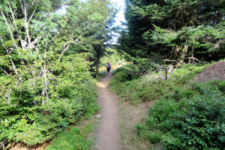 Der nun folgende 228 HM Abstieg erfolgt auf schmalen und unebenen Pfaden und mit allen Gemeinheiten gespicktem Untergrund. Wir laufen durch einen lichten Bergwald und über teilweise heidebewachsene Viehweiden entlang der „Haute de Falimont“. Auf einem breiten Wanderweg geht es dann bequem abwärts zum „Col de la Schlucht“ auf 1139 müNN. Über diesen Pass führt die vielbefahrende Landstraße D 417 von Colmar nach Lothringen. Die Passstraße stammt aus den 1860er- Jahren und deutete seinerzeit den Beginn einer neuen Epoche des alpinen Straßenbaus an. Die heutige Passstraße wurde teilweise in den Fels gesprengt. Die Passhöhe ist heute ein stark besuchter Touristenmagnet mit vielen Hotels, Souvenirläden, Sessellifts, einer Sommerrodelbahn und mehreren Parkplätzen.