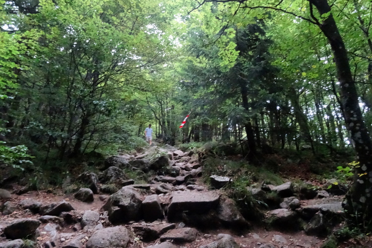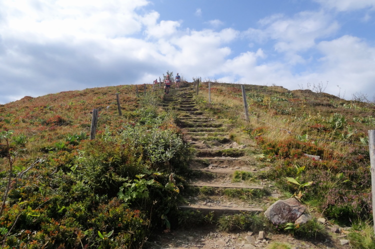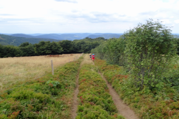 Nicht nur steinige Wege begleiten die Trailläufer auf den ersten Kilometern, sondern auch grasbewachsende Trampelpfade über Kuhweiden. Der Wanderweg GR 5 ist zu Anfang nicht als besonders schwer zu bezeichnen, was sich im weiteren Verlauf aber noch ändern wird. Über einen Wiesenpfad geht es ab der VS sogleich wieder bergan und in ein Waldgebiet hinein. Nach diesem Waldstück gelangt man an den ersten der vielen Vogesengipfel, dem „Schweissel“ mit einer Höhe von 1271 müNN. Bei diesem steilen Aufstieg auf die baumlose Kuppe müssen dann sogar Stufen aus Holzbalken erstiegen werden.