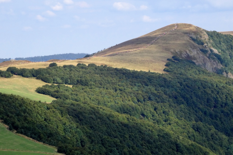 Der folgende Abstieg ist dermaßen schwierig, so dass an ein zügiges Laufen nicht zu denken ist. Es geht durch einen Wald, wo immer wieder große und kleine Felsen umlaufen werden müssen. Am „Collet du Lac Vert“ auf 1225 mtr. geht es aus dem Wald hinaus und man gelangt in das Naturschutzgebiet „Tanet - Gazon - Faing“. Immer bergan laufen wir mal im Wald, mal auf einer Hochweide zum Aussichtspunkt „Taubenklangfelsen“ auf 1299 mtr. Ab dem „Gazon du Faing“ ist dann der letzte Anstieg bewältigt.