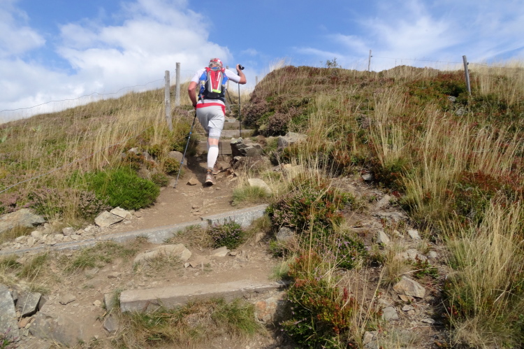 Nachdem die Anhöhe erreicht ist, geht es über eine schöne Heidelandschaft im mäßigen Auf und Ab zum „Col du Herrenberg“. Vor den Augen der Teilnehmer erscheint dann der nächste markante Buckel, der „Batteriekopf“, den es zu erklimmen gilt. Hier muss dann der Berggang eingelegt werden, denn es geht mächtig bergan auf 1311 mtr. So steil wie es hinauf geht, geht es auf der anderen Seite hinab. Bei diesem Abstieg müssen dann wieder viele Stufen springend und hüpfend bewältigt werden.