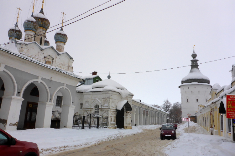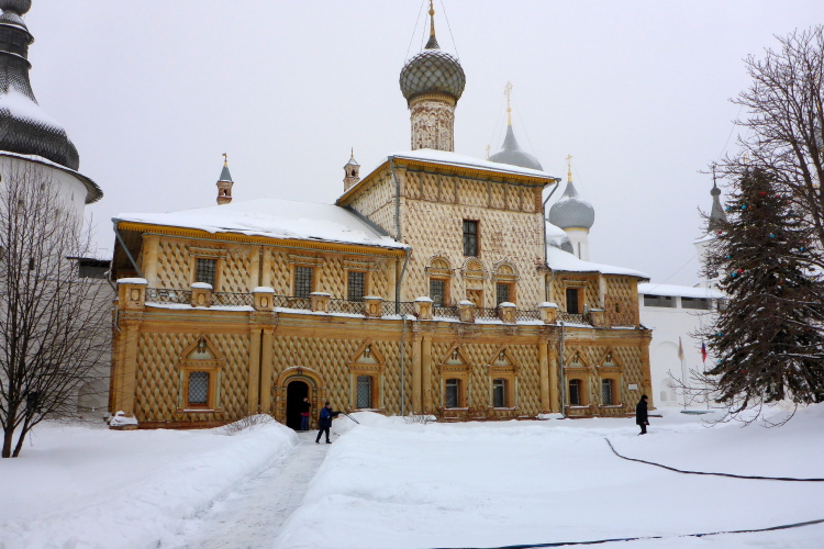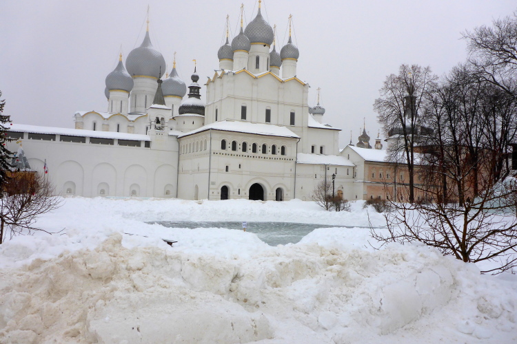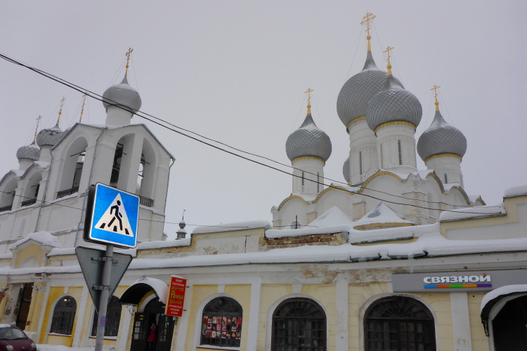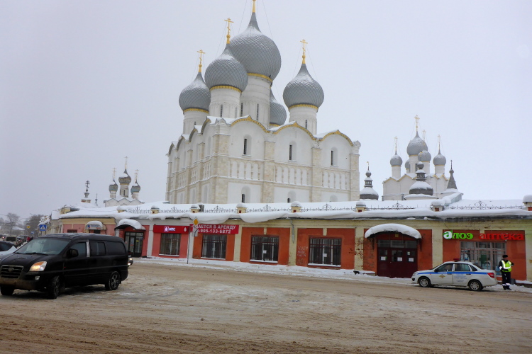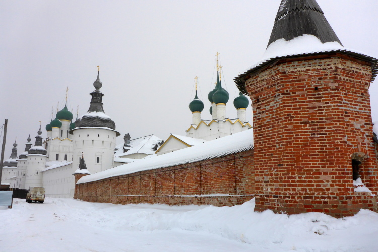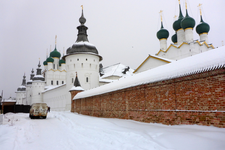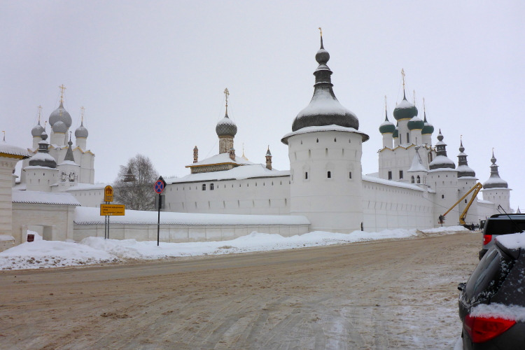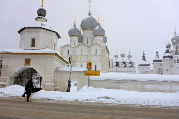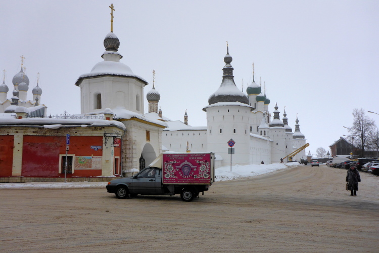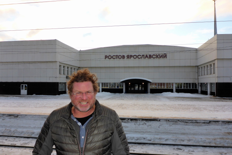Als der Läufer, gemeint ist der Teppich, im Wagon eingerollt wird, müssen wir die Schlappen anziehen, die wir im Fach vor uns zusammen mit einem Frühstück finden. Dann werden wir gefragt, was wir zu Mittag essen wollen. Ein Kosake, der englisch kann, hilft uns. Nach drei Stunden und 200 Kilometern Fahrt landen wir in Rostov Jaroslawski. Etwas deutscher nennt man die Stadt Rostow am Nerosee. Es ist nicht Rostow am Don, an das unsere Väter und Großväter schlechte Erinnerung haben.