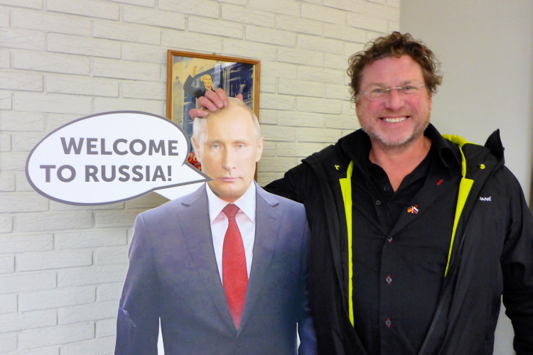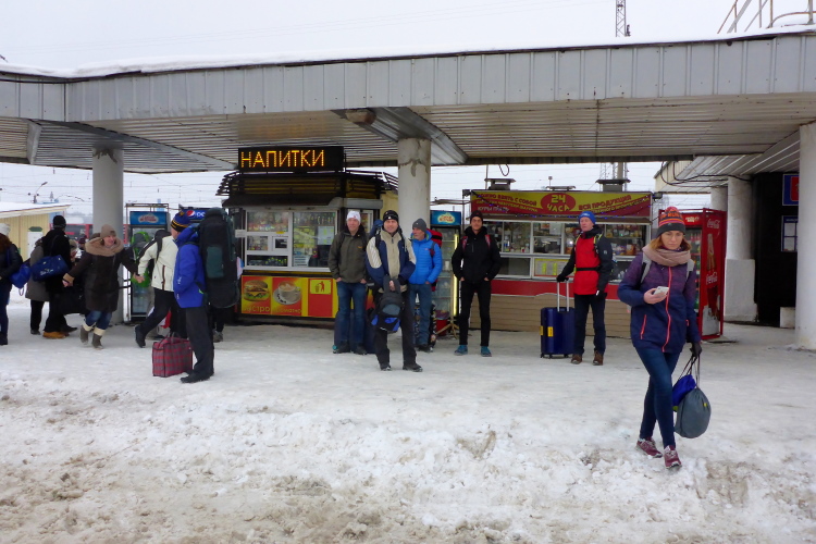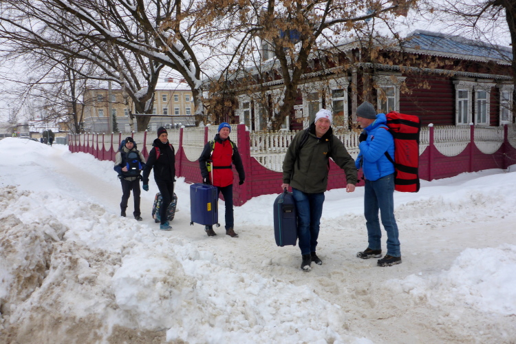 Der Bahnsteig ist schlimm vereist, zwischen kilometerlangen Güterzügen laufen wir über die Gleise. Ich meine ein eingeritztes „Hauptmann Kelbel war hier“ an einem der alten Viehtransporter zu erkennen. Knöcheltief steht der schmutzige Schnee auf dem Bahnhofsvorplatz. Es gibt Taxis, die wollen uns aber nicht mitnehmen. Also dackeln wir zu Fuß Richtung Nerosee. Aschu und Reinhold (ich glaube Uwe auch) haben Rollkoffer. Läufer, die Rollkoffer ziehen, sind peinlich, vor allem im russischen Winter oder in der Sahara. Gerno, Harald und ich sind da erfahrener. Mathias ist mit Dana weit draußen in der Taiga untergekommen. Der Weg zum Hotel ist beschwerlich. Die Häuser des Ortes verfallen, einige sind abgefackelt. Ich peile schon mal, wo man Bier kaufen kann. Diese Locations nennt man hier Dixies.