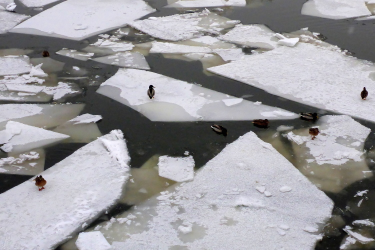 Nach vier Kilometern gelingt es mir, einigermaßen die Fußstapfen der Vorläufer zu treffen, doch wenn ich in den linken Fußabdruck mit dem rechten Fuß trete, haut es mich wieder um. Im Schilf verliere ich den Anschluss, der Läuferdruck hinter mir wird unerträglich. Gut dass ich nicht verstehe, was hinter mir gesprochen wird. Vielleicht bin ich, die Staumauer, ein Lebensretter, denn von denen hinter mir wird niemand den Zielbogen durchlaufen. Mittlerweile sind an meinen Schuhen die Eisfelder so dick geworden, dass sie ständig aneinander stoßen. Die offenen Gamaschen behindern zusätzlich. Die Hosenbeine haben sich in ihrer Kältestarre nach oben gekrempelt, sodass ständig Schnee in meine vergletscherten Schuhe dringt. Eisangler mit ihren Bohrmaschinen auf der Schulter kommen mir entgegen. Machen die auch Sport?