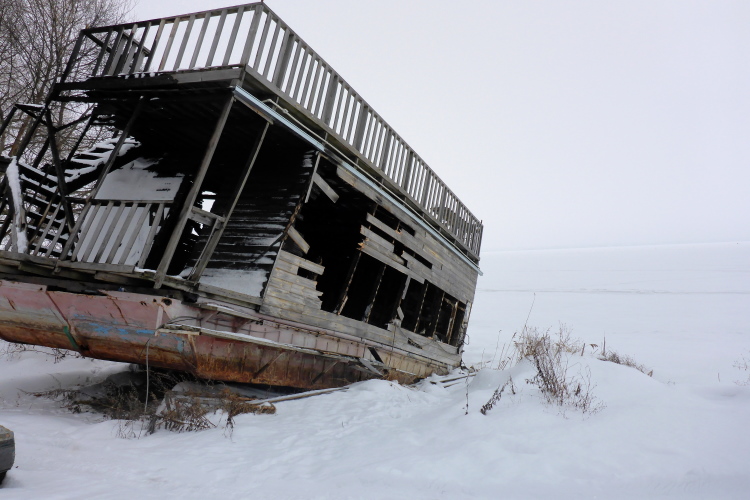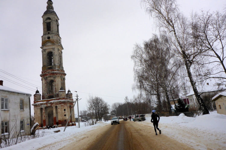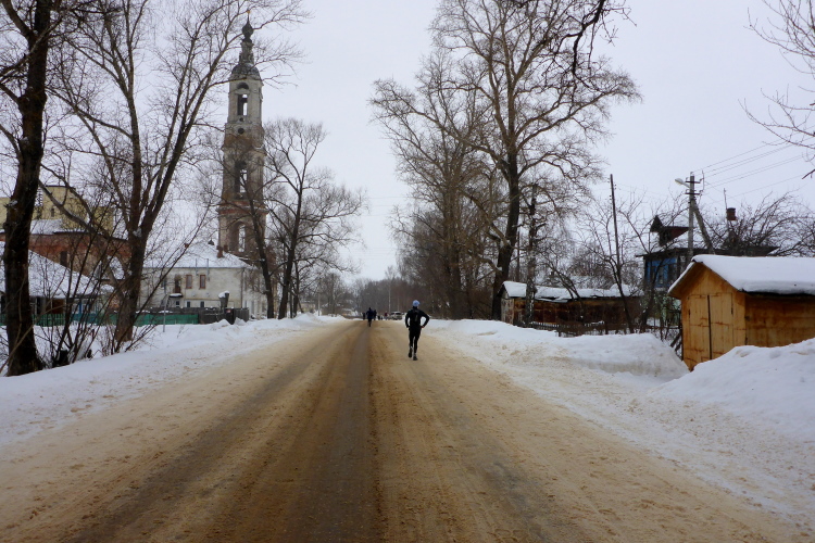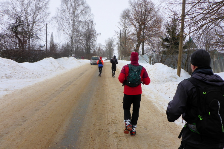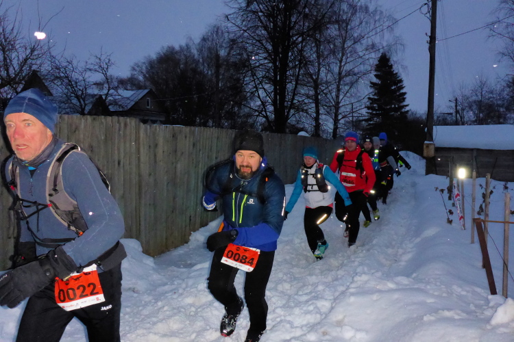 Nach 12 Kilometern und drei Stunden endlich laufbarer Untergrund. Auf dem Fluss sitzen Angler, fette Flussbarsche liegen auf Eis. Der Geruch von Blut steigt in meine Nase, es ist mein Blut. Als ich die verschneite Dorfstraße hinauflaufe, streuen Dörfler Asche vor meine Füße, heben aber nicht den Blick, um mich zu grüßen. Vier Matrjoschkas schwätzen auf der Straße, schauen mich nicht an, machen keine Gasse, ich bin uninteressant, ich bin ein Nichts. Und doch ist mir nach nur wenigen Tagen in Russland klar, dass ich jederzeit Hilfe erwarten kann. Abgesehen vom Winter ´42 geht mir das Lied von Dschinghis Khan durch den Kopf: „Moskau ist ein schönes Land, hahahaha!“ Definitiv werde ich nochmal zu einem Trail der Running Hereos in Russland antreten, definitiv nicht mehr im Winter, definitiv nicht mehr dieses Ding hier!