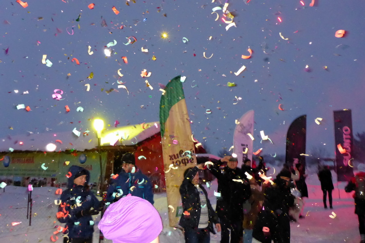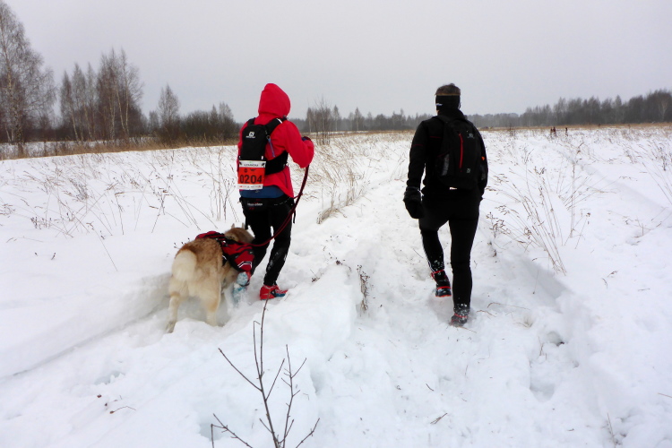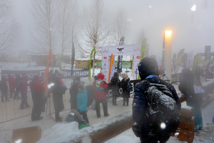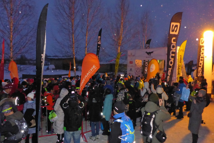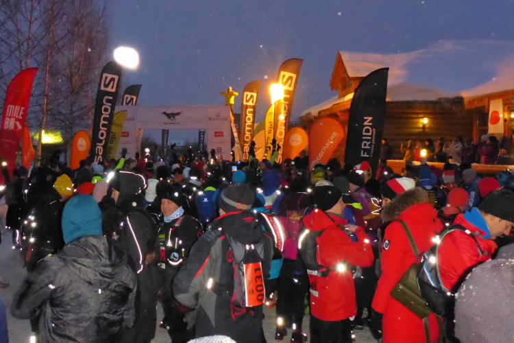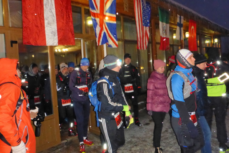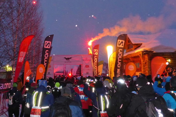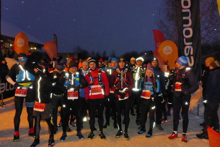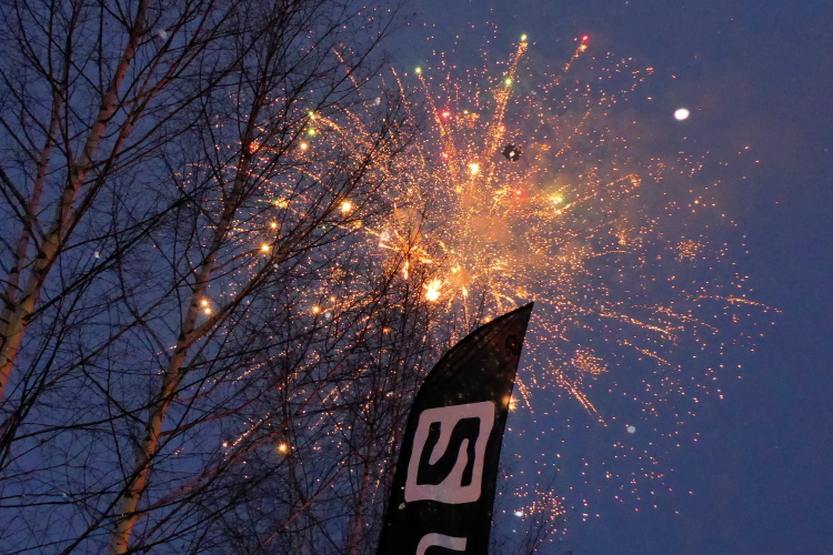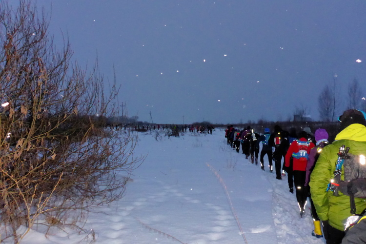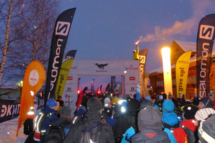 Mikhail klettert auf´s Starttor, hält ein grell rotes Signallicht über unsere Köpfe, dann wird der kalte Morgenhimmel von einem grandiosen Feuerwerk erhellt, aus dem glitzerndes Konfetti fällt und uns die Sicht nimmt. 500 Läufer fetzen los, wir sind gleich abgehängt. Ich freue mich, der Schnee ist griffig. Nach 100 Metern Stau, der Pfad beginnt. Wir lachen, wir haben ja 12 Stunden Zeit. Niemand von uns glorreichen Sieben hätte geglaubt, dass unser Schicksal jetzt schon entschieden ist, denn auf den nächsten zwölf Kilometern gibt es keine Möglichkeit zum Überholen. Die letzten 350 Läufer werden nicht finishen. Nach 50 Metern rutsche ich das erste Mal aus und liege im Sumpf. Helfende Hände. „ Spasibo, Spasibo“ raune ich, raffe mich fluchend auf. Harald erwischt es schlimmer, er ist bis zu den Knien im Wasser. Ein Husky latscht mir ständig von hinten auf die Füße, ich lasse ihn vorbei, falle rücklings in den Schnee. Helfende Hände. „Danke, danke“ schimpfe ich, jetzt auf Deutsch. Der trockene Schnee ist wie Sand, die Klettverschlüsse meiner Gamaschen greifen nicht mehr.