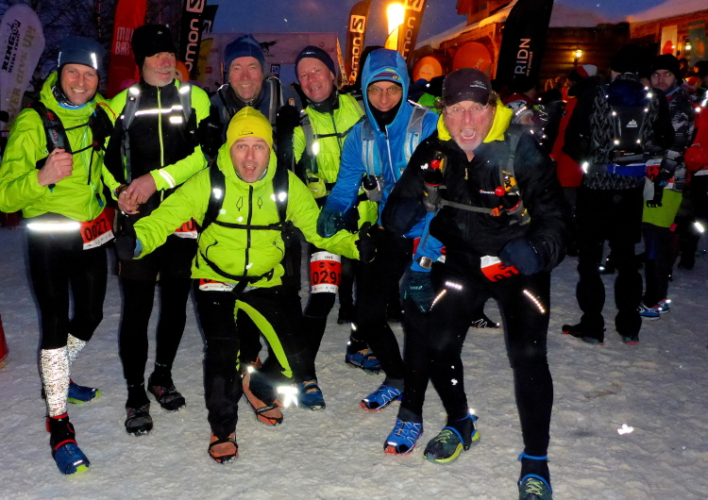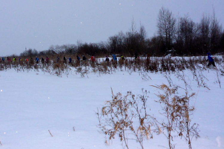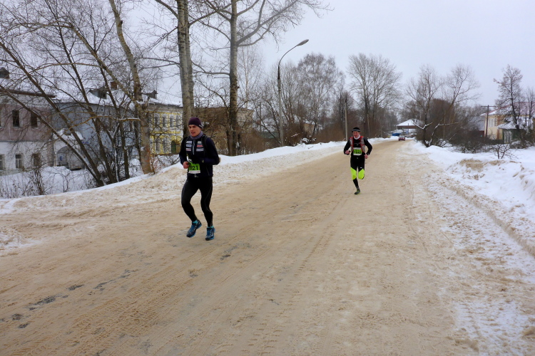 Die folgenden acht Kilometer sind laufbar. Es sind die einzigen auf den 70 Kilometern, der Rest wird wie die ersten 12 Kilometer sein. Die schnellen 30km-Läufer kommen mir auf der mit schmutzigem Schnee bedeckten Straße entgegen. Kurze Hose, super!