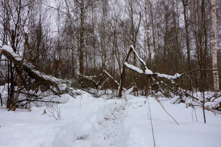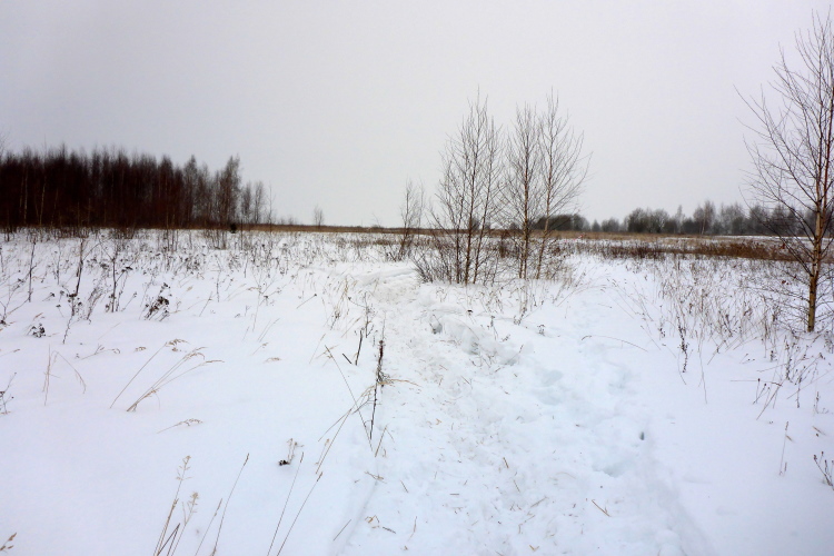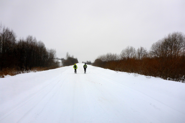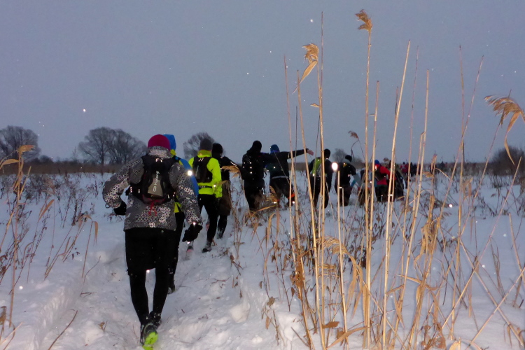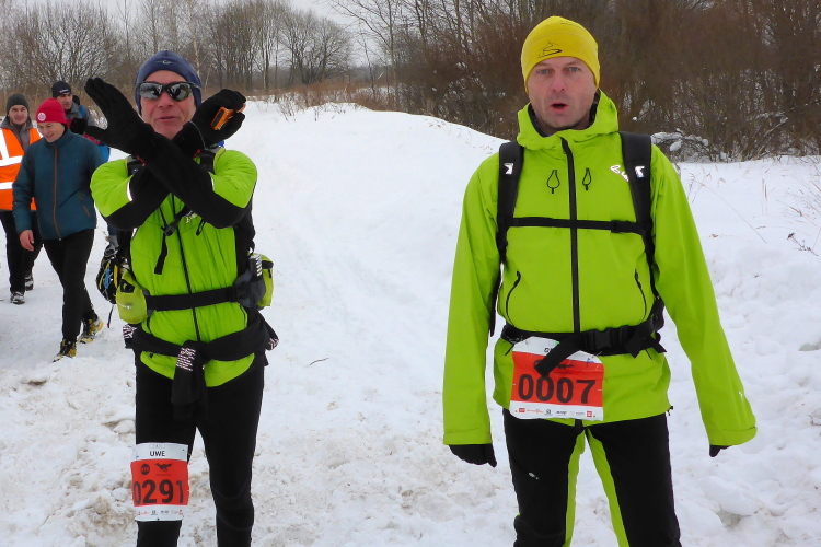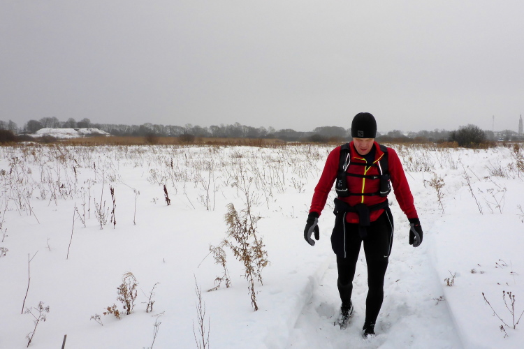 Die weißen Schilffelder werden nun durch Wälder mit schneebedeckten Bäumen ersetzt, zwischen denen sich der Schnee unterschiedlich dick angesammelt hat. Der Pfad ist jetzt 10 Zentimeter breit und 20 tief. Büsche peitschen mir ins Gesicht, mein rechter Fuß schleift hinterher, die Sehnen lassen sich nicht mehr bewegen. Ich bin allein. Das ständige Meeresrauschen im Kopf stammt von den kilometerlangen Zügen in der Ferne, die Flüssiggas aus Sibirien transportieren. Die mentale Belastung kann ich mit meiner Erfahrung und Sturheit unterdrücken, und doch ist jetzt etwas ganz neu: Ich zähle zu den Verlierern und die Nähe zum Winter ´42 wird real. Andererseits möchte ich auch keine Menschen sehen, mir ist mein Leiden zu peinlich. Fitnessmäßig ist alles im grünen Bereich, ich habe ausreichend Nahrung und Getränke dabei, doch der Untergrund bringt mich um. Ich will laufen, nicht abknicken und hinfallen. Kleine Bachläufe werden zu unlösbaren Aufgaben und doch habe ich die Hoffnung, dass dieser Scheiß endlich mal in eine Laufstrecke münden wird.