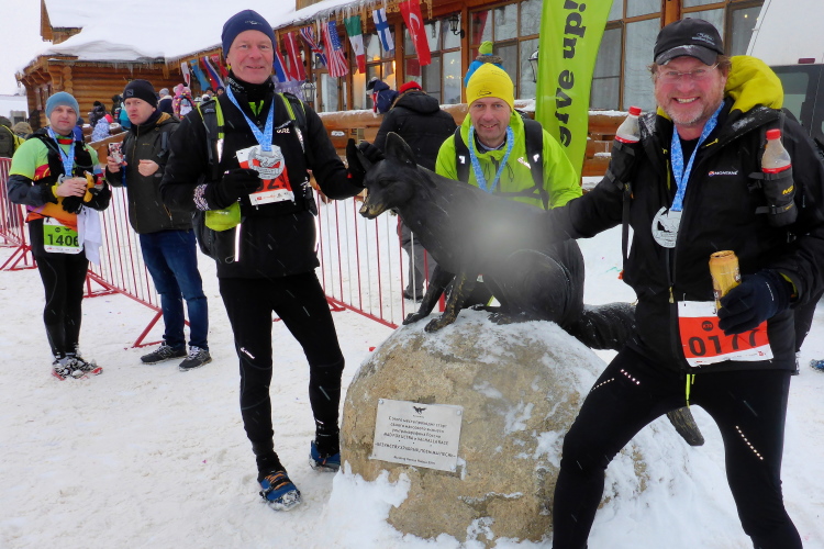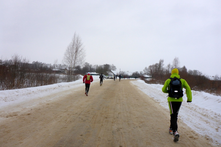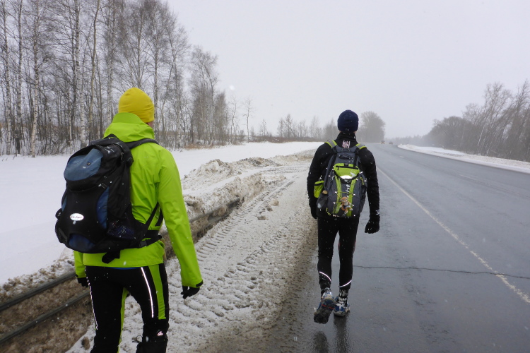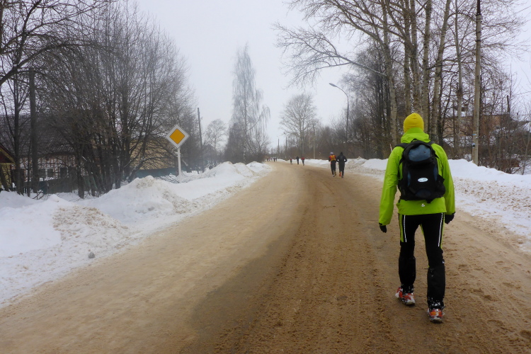 Ein Läufer kommt mir mit winzigen, schnellen Trippelschritten entgegen. Er macht keine Anstalten, ein Ausweichmanöver zu starten. Er schaut nicht auf, er grüßt nicht, er ist nicht von dieser Welt, ein seelenloser Tanker in einem gnadenlosen Eismeer. Was für ein Arsch, denke ich und weiche in den Schmodder aus. Am Abend raffe ich, dass dies Anton, der Gewinner des 100 Meilen Laufes war. Es folgen noch vier weitere menschenleere, stiere Tanker ohne Leben, die aber erst im Ziel zusammenbrechen. Noch nie habe ich so hohle Zombie-Maschinen gesehen. Es sind die einzigen der 97 Starter der 100 Meilen, die ankommen werden. Lange noch wabern die Bilder der Horrorgestalten in meinem Kopf, während ich durch das melancholische Grau der russischen Weite stapfe und über mein blödes Hobby fluche.