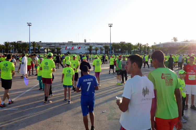 Vom Club Tagadirt sind es 400 Meter bis zum Startort. Um 7:45 sind Gerno und ich dort. Es wird klar, dass der Start wie 2016 um 8:30 sein wird. Uns wird jetzt auch klar, dass es nur etwa 20 Amateure auf der langen Strecke geben wird. Zum ersten Mal sehe ich in Marokko mobile Toilettenhäuschen, sie werden kaum genutzt. Der Startblock ist abgesperrt, aber vor der Sperre quetschen sich schon jetzt die Läufer, die ganz vorne dabei sein wollen.