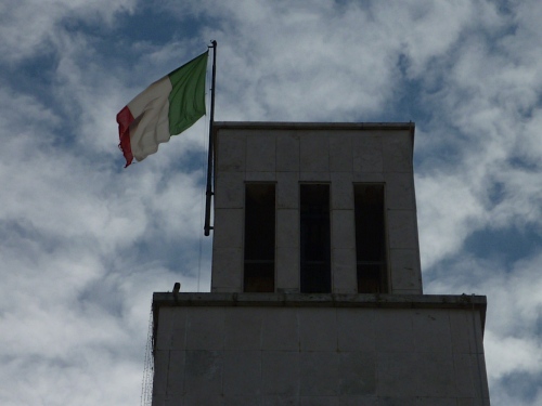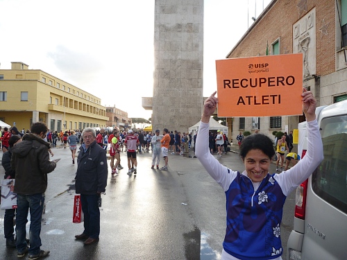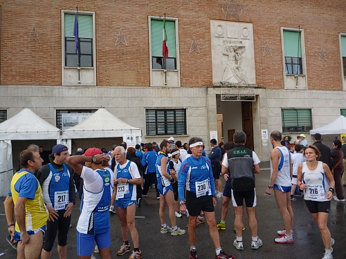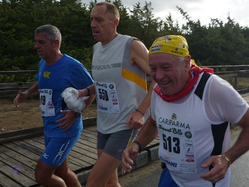 Wir starten mit den Stracittadinaläufern (2km) und den Competitivaläufern (11km, rote Startnummern) gemeinsam. Es geht durch das „Altstadtzentrum“ mit seiner typischen Architektur des „Rationalismus“ auf dem 2 km Kurs, dann auf dem 11km Kurs in einer zweiten, größeren und dann dritten, noch größeren Runde entlang der Küste, des Lago die Paolo und des Lago die Caprolace und wieder in das Stadtzentrum. Die ersten Kilometer sind von „Mama-Schau-Mal-Rufen“ und kolossaler Aufgeregtheit gekennzeichnet. Weisse Handschuhe winken in die nicht vorhandene Zuschauermenge und kündigen vom Heldentum glitzernder Paradisos. Im Nu bin ich Letzter, der Besenwagen direkt hinter mir. Ich werde ihn und zahlreiche andere Läufer noch oft wiedersehen.
