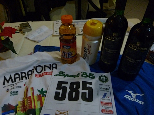 Prallgefüllter Startbeutel, Finishershirt und Funktionsshirt. Der Wein darf im Handgepäck die Heimreise nicht antreten, der Arme. Bei der Pastaparty wähle ich die Bohnensuppe, weil da so herrliche große Steinpilzstückchen drin sind. Beim zweiten Teller registriere ich, dass die Stückchen aus fettem, gedörrtem Speck sind. Es gibt Rotwein, aber auch der Weißwein nimmt nicht die Illusion von Steinpilzen.