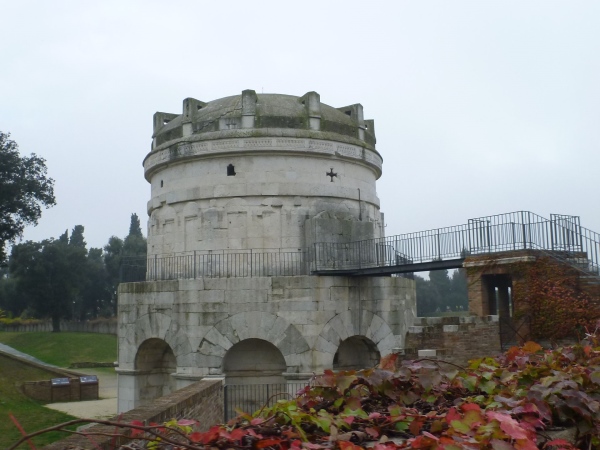 Ein Park mit einem markanten runden Gebäude kündigt sich an. Hierbei handelt es sich um das Grabmal des Theoderich aus dem Jahre 520. Besonderes Kennzeichen ist der einen Meter dicke und 11 Meter breite Kalksteinblock, der als Dach dient. Theoderich, bei uns eher bekannt unter dem Namen Dietrich von Bern, war Herrscher des Ostgoten-Reichs und hinterließ in Ravenna viele Baudenkmäler. Der Veranstalter verspricht, dass wir sieben der hier angesiedelten acht Unesco-Weltkulturerbestätten passieren. Das war die Nummer eins.