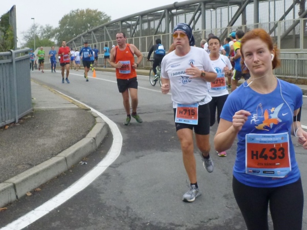 Nun beginnt eine sechs Kilometer lange Begegnungsstecke durch die Ebene. Ich sehe die Ballons der Drei-Stunden-Läufer, leider nicht den Thorsten. Stattdessen kommen mir Marek aus Polen, den wir vor dem Start trafen, und der Hund mit seinem Begleiter entgegen. Bei Kilometer 30/32 noch eine Band zur Auflockerung. Ich mache mir so meine Gedanken, wie es hier wohl im sprichwörtlichen Nebel wäre oder wenn die Sonne mal herunterbrennen würde. Kurz darauf brennt die Sonne herunter, verzieht sich glücklicherweise aber bald wieder.