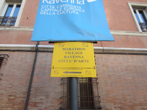 Als wir gegen 17 Uhr unsere Zimmer im Cube-Hotel etwas außerhalb von Ravenna beziehen, wird es rasch dunkel. Im Zentrum von Ravenna herrscht akuter Parkplatzmangel, Ernst stellt seinen Wagen in eine Garage nahe der Piazza Garibaldi, wo sich die Marathon-Expo befindet und die Läufer am Samstag bis 19 Uhr 30 das Startpaket abholen können. Das Ziel des Marathons befindet sich einen Steinwurf daneben – auf der Piazza del Popolo, wo ich auch 2011 eingelaufen bin.