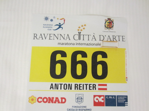 Die Expo ist relativ klein, von einer Verkaufsmesse kann man nicht sprechen. Lebensmittel wie Käse und Brot aus der Region Emilia-Romagna werden zum Verkauf angeboten. Die Leute sind alle sehr freundlich. Sieht man von der Startnummer 1600, die ich bei meinem 5. Marathon im Dezember 2001 in Reggio Emilia erhielt oder der Nummer 1954, mein Geburtsjahr, beim Ironman Austria im Jahr 2004, so ist diesmal die Nummer 666 besonders reizvoll. Man kann Vieles in sie hineininterpretieren – ich nehme mir vor, das Rennen zumindest auf der ersten Hälfte etwas schneller anzugehen, um den Veranstaltern zu zeigen, dass ich diese Geste zu schätzen weiß. Ich kann es nicht oft genug wiederholen, die Italiener lieben Sport über alles, nirgendwo sonst werden Starterpakete mit so viel Anteilnahme und Herzblut gefüllt und ausgehändigt. Die ehrenamtlichen Helfer leben alle förmlich mit, an den Labestellen freuen sie sich sichtlich, einem Läufer den Becher in die Hand zu drücken.