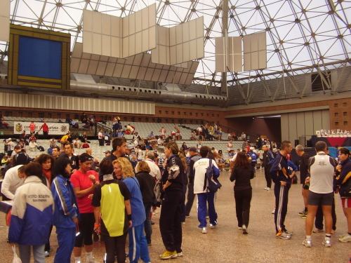 Der Pala de Andre, eine moderne Veranstaltungshalle ist schnell gefunden, keine 15 Gehminuten von unserer Herberge entfernt. Ohne große Formalitäten (das laut Ausschreibung angeforderte „Medizinische Zeugnis“ interessiert hier niemanden) erhalten wir Startnummer und Chip. Das versprochene T-Shirt sollten wir nach Rückgabe des Chip erhalten, wurde uns mitgeteilt. Viel war nicht los unter der riesigen Kuppel, ein einziger Verkaufsstand präsentiert etwas einsam seine occasioni. Ein Rundgang erübrigt sich somit und wir wandern kräfteschonend zurück zum B & B.