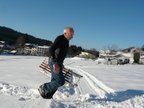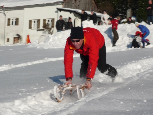 Der Kurs geht 100 Meter im Tiefschnee hinab, und eine Markierung herum und wieder zurück. Wechsel. Der folgende muss mit einem Schlitten hinunterfahren und dann sein Gefährt hochtragen. Vier Personen sind ein Team und jeder muss zwei Mal ran. Ich kenne Willi schon und habe gerochen, dass da schöne Aufnahmen warten. Überzeugt Euch davon. Und ganz einfach ist die sportliche Betätigung nicht, denn einige Renner schnaufen wie die Ochsen.