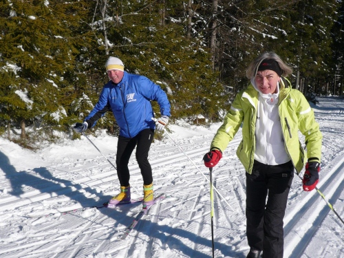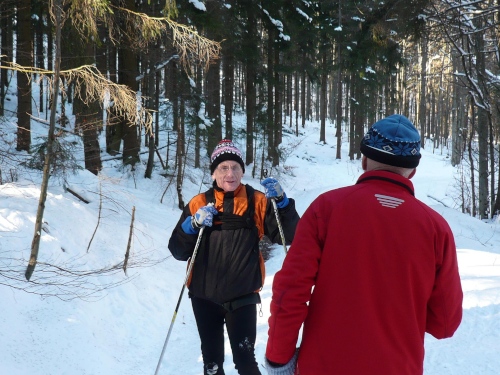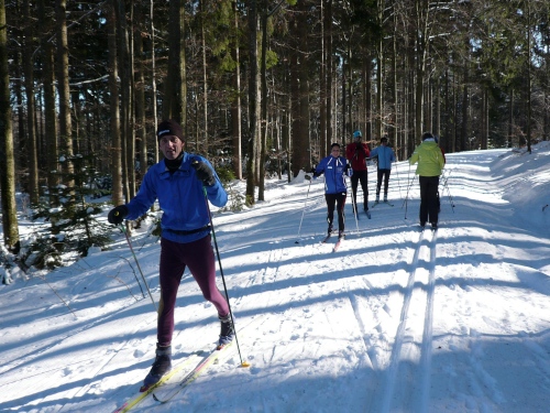 Nach dem opulenten Frühstück geht es zum Langlaufen. Mit schmalen Brettern. Willi hat Guide Manfred Fellner engagiert. Und der 71jährige ist schon jahrelang als Franke im Bayerwald zuhause und hat die sprachliche Diaspora überlebt. Ein paar Stunden geht es auf der Bayerwaldloipe bei guten Bedingungen dahin. Immer leicht auf und ab, lediglich eine längere Steigung lässt uns ins Transpirieren kommen. Beim Rückweg löst das Gefälle bei einer Läuferin Angstschweiß aus. Sie schnallt ab und springt im Galopp hinunter. Ich habe Mühe dran zu bleiben.