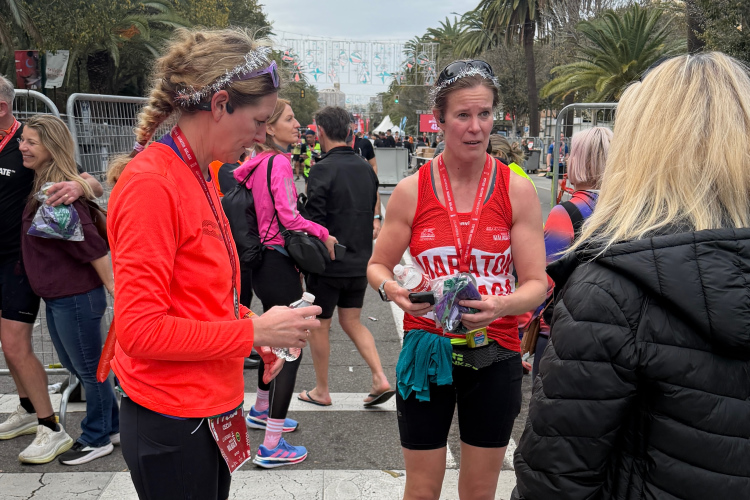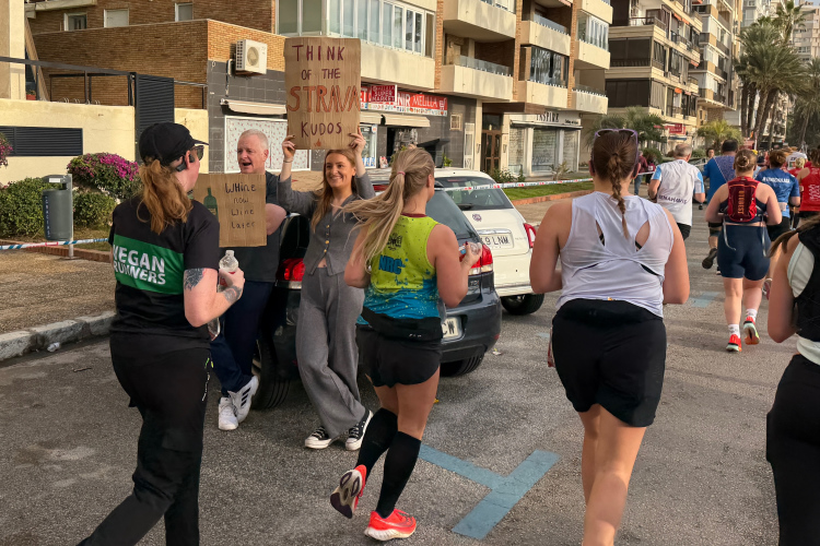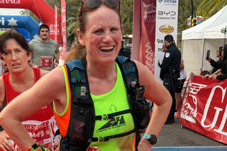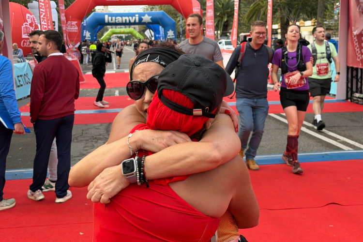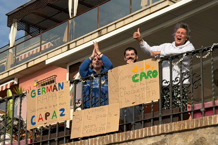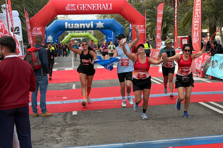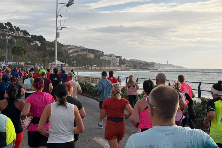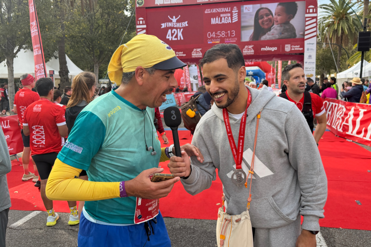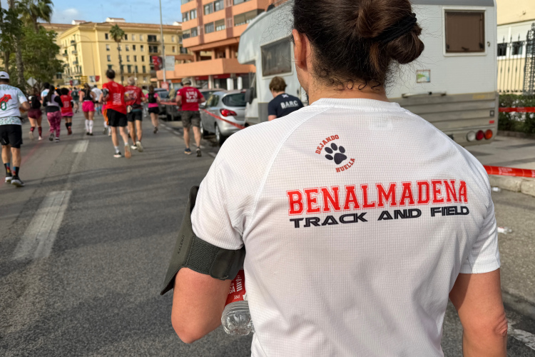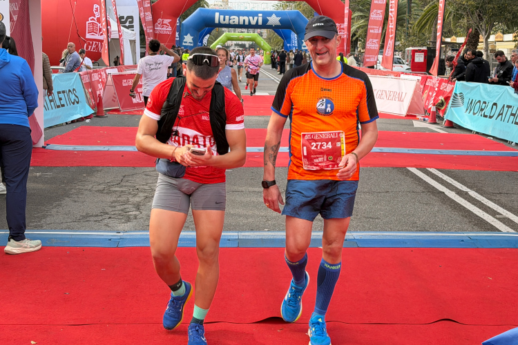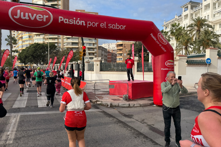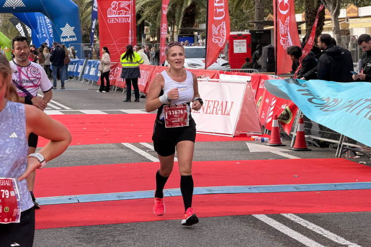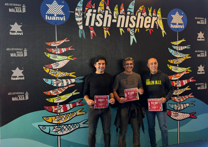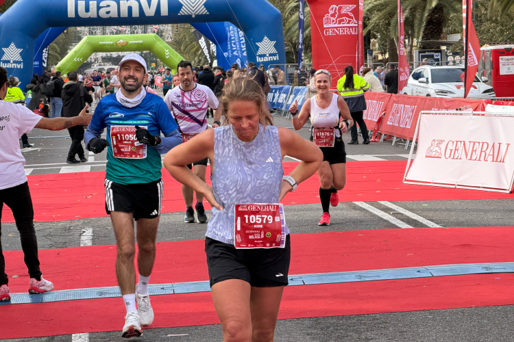 Judith kommt ein paar Minuten später als Zweite der AK ins Ziel. Die Medaille ist etwas Besonderes: In der Mitte sieht man aufgespießte stilisierte Sardinen, die sich im Ring der Medaille drehen lassen. Danach gibt es ein Finisherhemd mit lila-grünen Streifen. Die Rezeptionistin im Hotel findet das sehr schön und klärt auf: Es sind die Heimtrikot-Farben des Basketballclubs Unicaja Málaga, mehrfacher Sieger der Basketball Champions League.