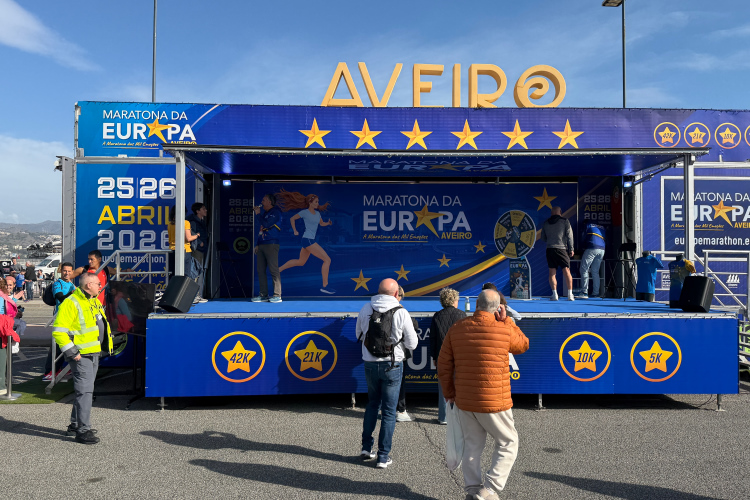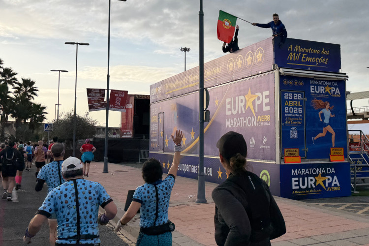 Hier stehen viele Toilettenhäuschen, da der Start gleich in der Nähe liegt, dann leicht rechtsdrehend auf die Farola de la Málaga, den Leuchtturm, zu. Nun auf die breite Straße hinaus zum Kreuzfahrtschiffterminal. Dort steht noch der Infobus vom Europamarathon in Aveiro in Portugal. Mit Besatzung und entsprechender Anfeuerung. Am königlichen Sportclub vorbei. Nun liegen Strände und Meer rechts von uns. Ein weiter Blick die Küste entlang.
