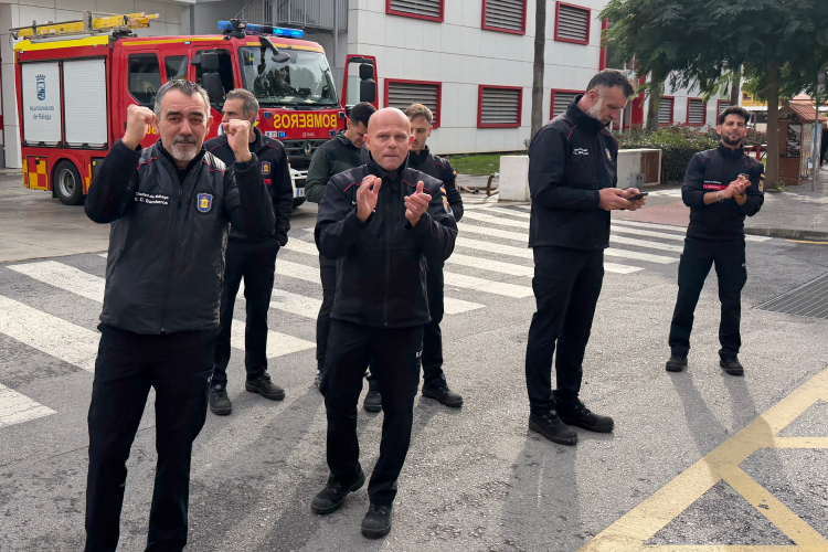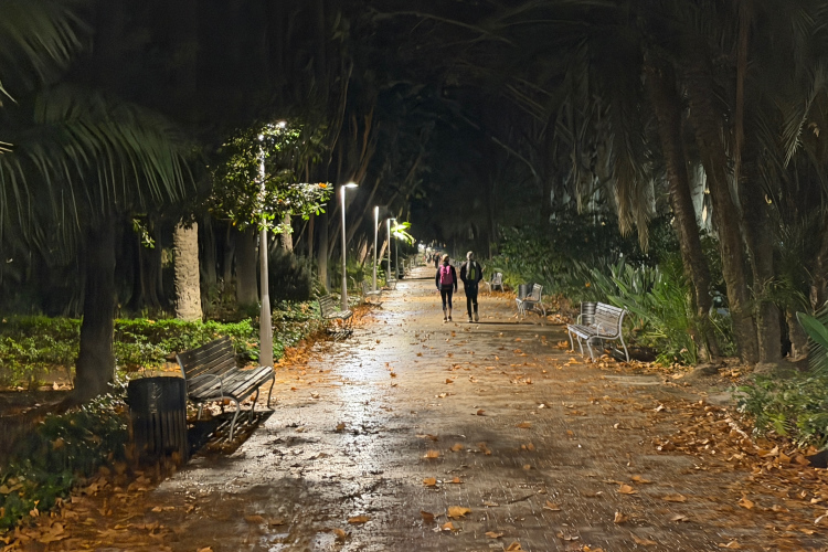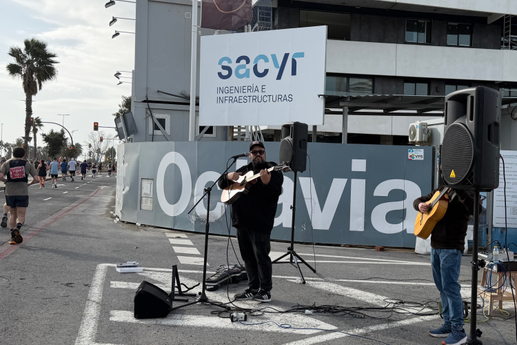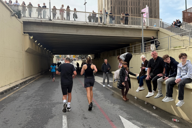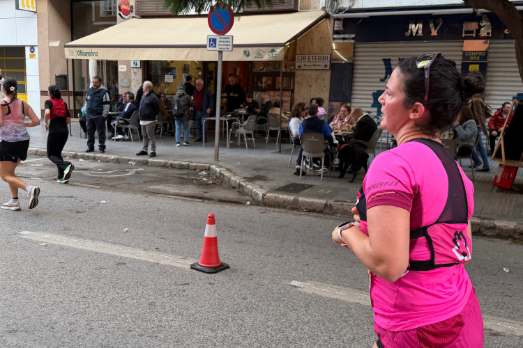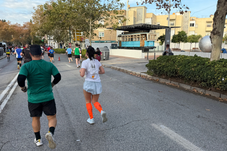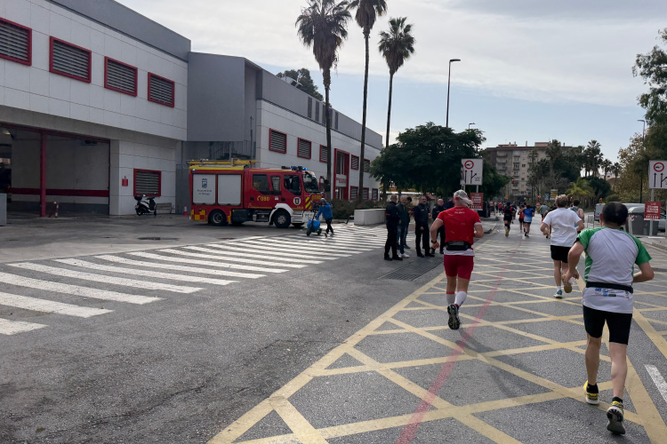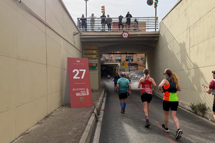 Bei Kilometer 26 an einer Feuerwache vorbei, und wie gewünscht stehen die Herren vor ihrem Bomberos-Wagen und feuern uns an. Wir tauchen bei Kilometer 27 in eine Unterführung ein. Oben waren wir bei Km 22. VP und dann recht rutschig auf dem folgenden nassen Boden. Auf der anderen Flussseite werden wir in mehr als 10 Kilometern fast schon im Ziel sein. Wir treffen nun auf die Allee an den westlichen Stränden von Málaga. Gegenverkehr, aber aktuell nicht wahrnehmbar, da wir auf der Seitenspur laufen. Ich sehe in ein Hallenbad. Nett. Heute bin ich gut drauf, sodass ich mich von Judith verabschiede und versuche, etwas mehr Tempo zu machen.