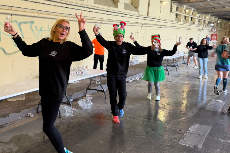 Wir treffen Henry, der schon zum wiederholten Mal wegen dieser Weihnachtstimmung herkommt und natürlich wegen uns. Er war früher oft marathontechnisch unterwegs, in seinem schwarz-weiß gestreiften Bodysuit samt weißem Hut und Handschuhen. Aber ihn haben die altersbedingten Zipperlein leider schon recht früh erwischt.