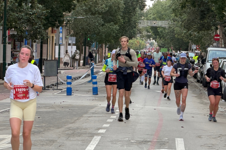 An der nächsten Ecke treffen wir auf entgegenkommende Sportlerinnen und Sportler. Die sind kurz vor Kilometer 21. Da ist dann auch zuschauertechnisch die Hölle los.