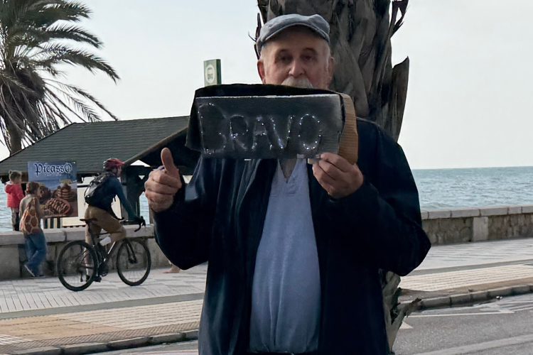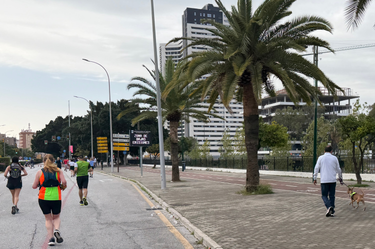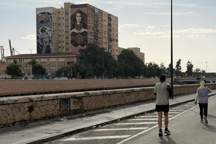 Der Paseo Marítimo Pablo Ruiz Picasso kann es mit den ganz großen Marathonstrecken am Meer aufnehmen: Palmen, schöne Häuser und Villen, Strelitzien und schöne Blicke auf das Meer. Für den Herrn mit Anzug und Krawatte, der aus seiner neuen Villa auf uns hinabschaut, einer der seltenen Momente, bei denen auf der vierspurigen Allee kein Autoverkehr herrscht. 1.250 km ist die N-340 lang und verläuft von Cádiz bis Barcelona. Für mich interessant die vierstelligen Kilometerschilder.