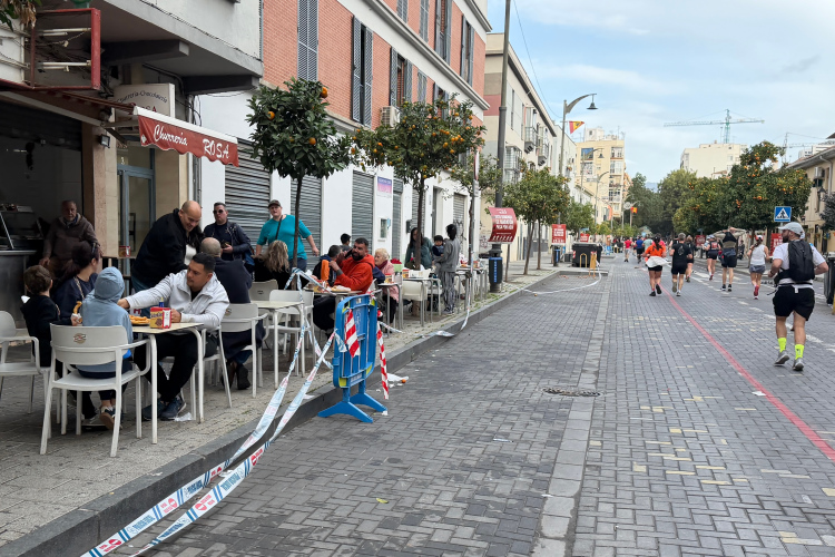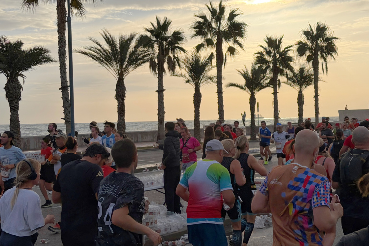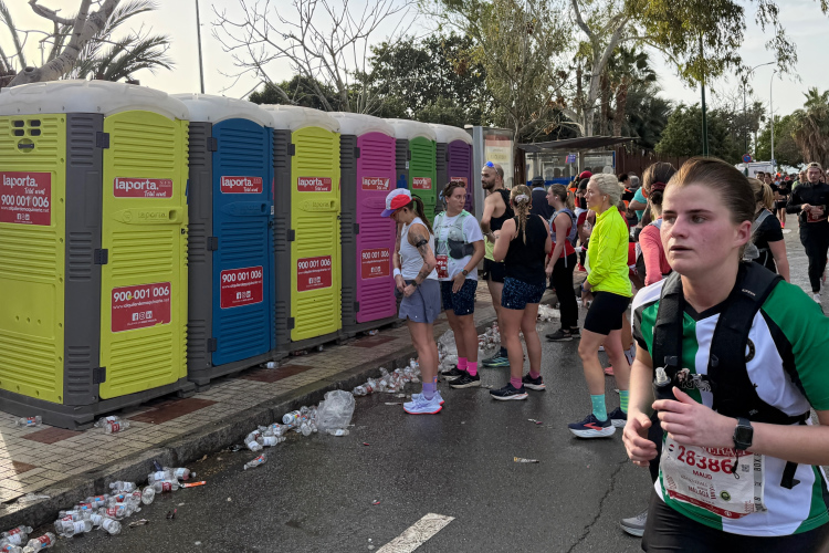 Wendestelle mit leichtem Anstieg, großer VP, wie immer mit Iso-Getränken in Bechern, Bananen, Orangen und 0,3-l-Wasserflaschen mit Málaga-Marathon-Etikett. Die VPs stehen alle fünf Kilometer und werden später mit Wasserstellen ergänzt. Und jeweils sechs Toilettenhäuschen, die aber bei 20.000 Teilnehmenden gut ausgelastet erscheinen.