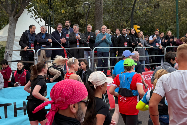 Noch mal ein Startschuss vom Bürgermeister Francisco de la Torre Prados, inzwischen seit 25 Jahren Bürgermeister und ein großer Fan des Marathons. Hinter dem Startbogen werden wir ihn applaudierend sehen. Aber erst einmal geht es langsam voran. Um 8:50 Uhr sind Judith und ich dann auch auf der Piste.