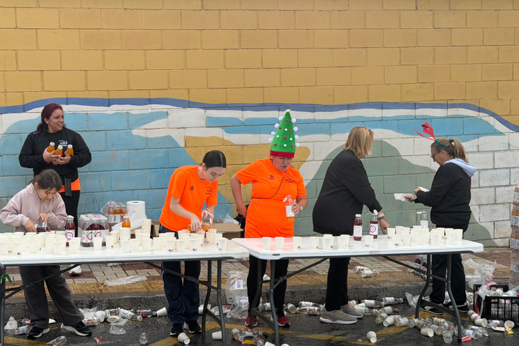 Die Zielverpflegung besteht aus Iso-Getränken in Flaschen, Wasser und Orangenstücken.