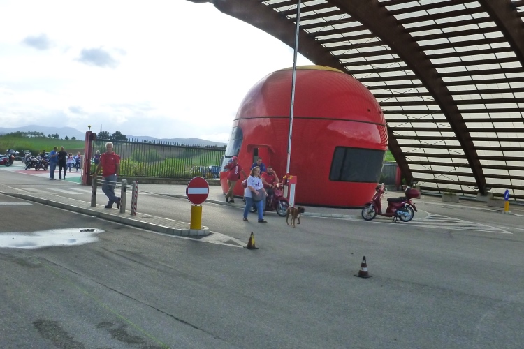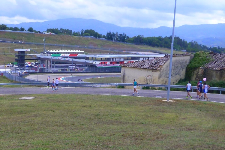Eine Gruppe Motorradfahrer erwartet uns am Eingang zum Autodromo Internazinale del Mugello oder einfacher Mugello Circuito. Vom höchsten Punkt der Laufstrecke haben wir einen Blick auf den 5,24 km langen Rennparcours von Ferrari. 1974 eröffnet - im Jahr der ersten Austragung des Mugello Marathons - wird diese Anlage seit fünf Jahren durchlaufen. Heute sind hier unzählige Motorradfahrer unterwegs, das Geräusch der Maschinen ist unglaublich. Ich bin zutiefst beeindruckt. So eine Marathonführung ist wahrscheinlich einzigartig. Schon 1914 wurden im Mugello-Tal Autorennen veranstaltet.