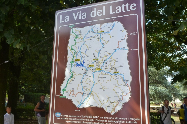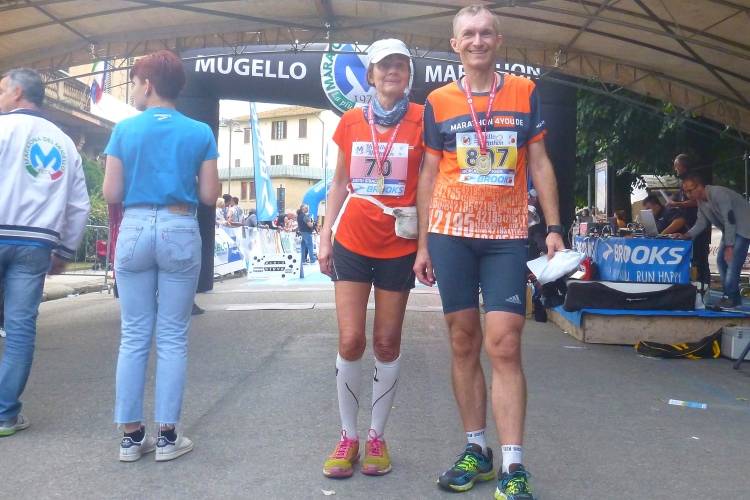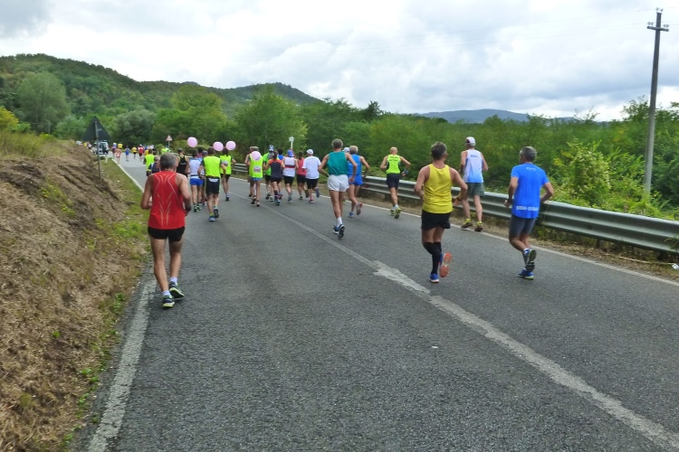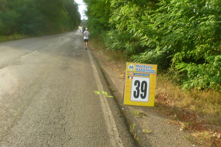 Um die lange Anreise zu einem kleinen Urlaub auszuweiten, verbringen wir anschließend ein paar Tage am Meer in Rimini, wo wir dieses Jahr im April auch schon am Marathon teilgenommen haben. Dort belegen wir im Kreise von italienischen Rentnern und Familien mit Kleinkindern die freien Plätze am Strand. Und da uns der „Halbe“ in Bologna nicht reicht, gehört noch ein ganzer Marathon ins Programm. Cesenatico am 18.9. hätte sich angeboten, aber da waren wir erst im vergangenen Jahr. Bei meiner Recherche stoße ich auf den ältesten (più antico) Marathon Italiens. Er wird im Gebiet Mugello (gespr. Mudschällo) 30 Kilometer nördlich von Florenz und 100 Kilometer von der Adria entfernt ausgetragen, und zwar heuer zum 43. Mal. Von Vorteil für uns ist der Starttermin am Samstag um 14:30 Uhr, so dass wir nach dem Frühstück aufbrechen und um 12:00 Uhr nach einer wunderschönen Fahrt über den Apennin entlang der Faentina-Eisenbahnlinie im Start- und Zielort Borgo San Lorenzo ankommen.