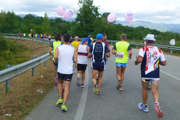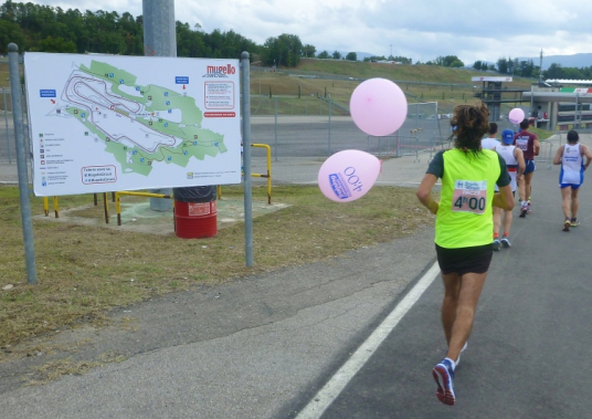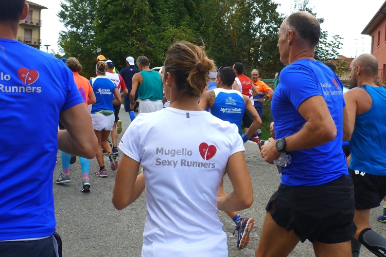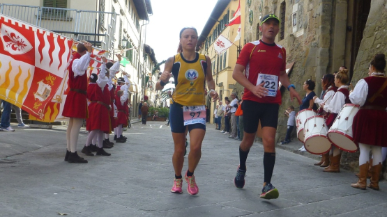 Die 12.000 Einwohner zählende Gemeinde Borgo San Lorenzo ist so etwas wie der Hauptort im Mugello-Tal. Schon im zweiten Jahrhundert vor Christus waren die Römer hier. Eine nette kleine Altstadt liegt gleich neben der Piazza Dante. Nach unserem Einsatz in Bologna vor gerade mal sechs Tagen und dem Hinweis des Veranstalters, dass dieser Lauf sich nicht für Bestzeiten eignet, stelle ich mich mal hinter zwei hübschen 5-Stunden-Pacerinnen auf. Der Startschuss fällt nach Trommelwirbel und Fahnenschwenken eines örtlichen Folklorevereins um 14:35 Uhr und Judith und ich erkennen sofort, dass die 4-Stunden-Herren eher unserer Geschwindigkeitsklasse entsprechen.