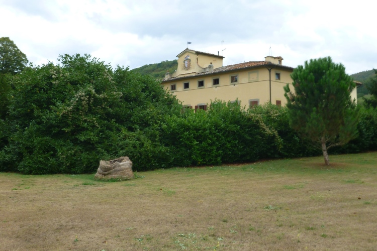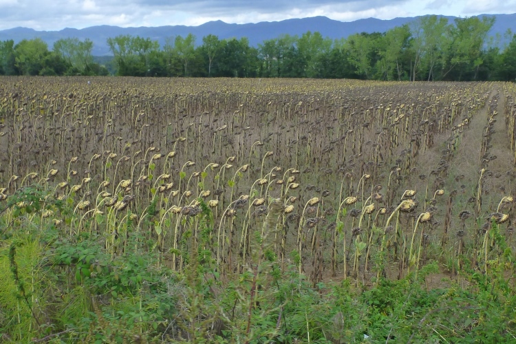 Wie für Deutschland war heute auch für Italien Regen angesagt. Wir haben jedoch Glück. Die Nachmittagssonne brennt auf uns herab und es folgen zwei sanft ansteigende Kilometer durch die Felder. Ich weiß jetzt, dass ich eher die kühleren Lauftage liebe. Nicht, dass Judith nun auch noch davon zieht! Die Bewohner der Ortschaft Luco Mugello erlösen mich von meinen trüben Gedanken. Mehr als 100 Höhenmeter laufen wir auf den nächsten 5 Kilometern bergab. Die Landschaft wird wieder abwechslungsreicher und einige dunkle Wolken ziehen auf. Es geht an einer Flugpiste vorbei. Viele Sonnenblumen stehen am Wegesrand. Jetzt fehlen nur noch ein Flugzeug und Krähen, um einen Hitchcock-Thriller lebendig werden zu lassen. Im Jahr 1559 erließ der Florentiner Herrscher Cosimo I de` Medici, dessen Familie aus dem Mugello stammt, das erste Umweltschutzgesetz, um die Wälder hier zu erhalten und somit Schäden durch Wind und Erosion zu vermeiden.