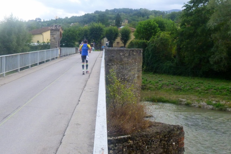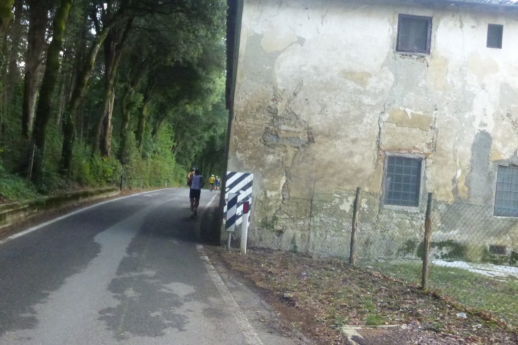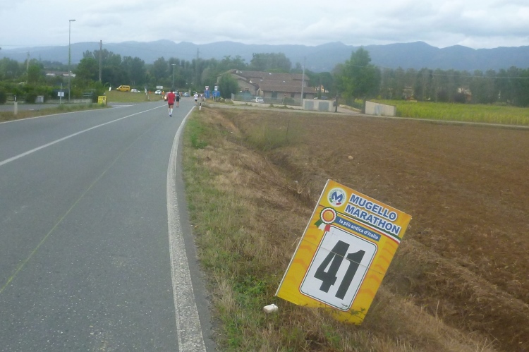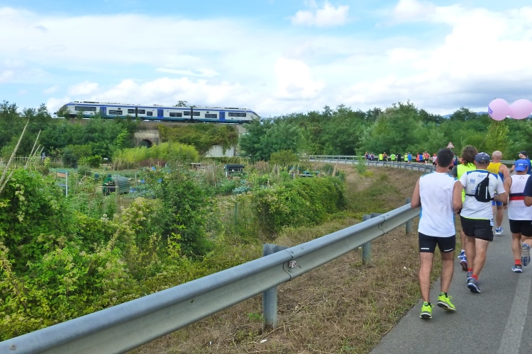 Den kleinen Eisenbahner in mir erfreut schon mehr die bevorstehende Querung der 2009 eröffneten Schnellfahrtrasse von Florenz nach Bologna. Die 78 km lange Strecke führt auf 71 km durch 10 Tunnel. Das Mugello-Tal wird oberirdisch gequert und ich habe Glück: Direkt über dem Tunnelmund nach Florenz (18,71 km Länge) kommt ein Zug angeschossen. 300 km/h hat der drauf, auch nicht viel schneller als wir Sportsfreunde. Noch kurz sei erwähnt, dass etwas weiter westlich der 18,5 km lange Apenninbasistunnel 1935 die Fahrzeit zwischen Bologna und Florenz auf eine Stunde drückte, während man auf der 1864 errichteten Porettana-Bahn noch fünf Stunden unterwegs war. Und wie es das Glück so will, fährt gerade ein Dieseltriebwagen auf der 1893 eröffneten Faentina in die Po-Ebene nach Faenza und weiter nach Ravenna, wo es bekanntlich auch einen schönen Marathon gibt...
