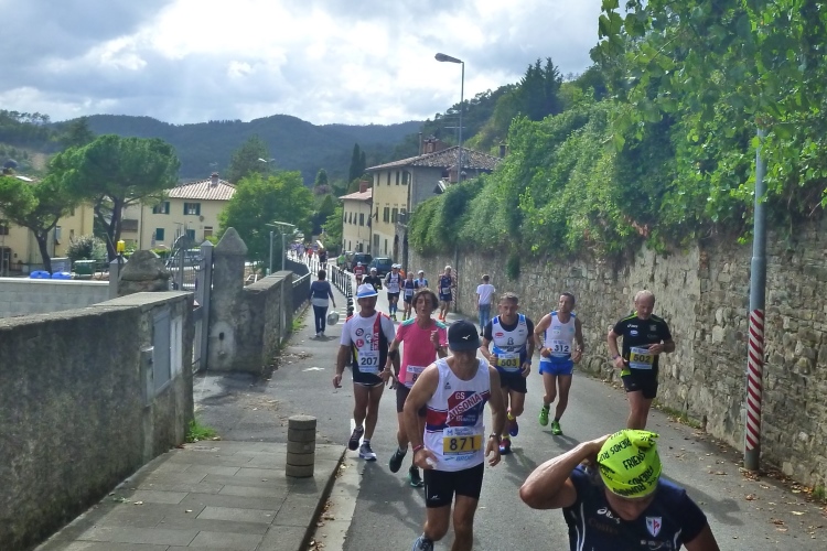Wir queren mit Hilfe der Polizei die Via della Resistenza und sind nach gut 29 km wieder am Startbereich in Borgo San Lorenzo. Hier besteht die Möglichkeit, mit Zeitnahme auszusteigen und sich in eine 30-km-Wertung ohne Wettbewerbscharakter aufnehmen zu lassen. 147 Teilnehmer machen das, so auch Alberto, der uns anfangs erzählte, dass er (wie wir) nächstes Wochenende den Berlin-Marathon bestreiten wird. Solche kürzeren Läufe der Kategorie „non competitivo“ könnte man in Italien auch viel günstiger bekommen. Diese „Marcie“ werden in vielen Gemeinden ausgetragen. Mit Verpflegung, aber ohne Zeitnahme kostet der Start meist zwei bis fünf Euro. Unbedingt zu empfehlen, wenn ihr mal in Italien Land und Leute „laufend“ kennenlernen wollt.