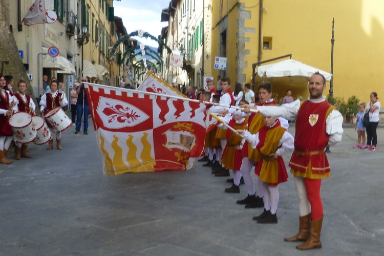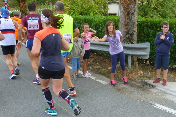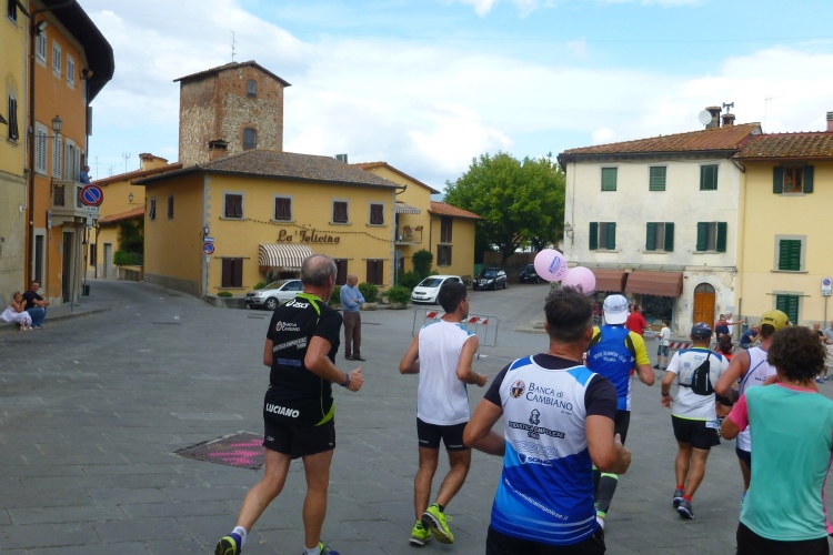 Genug der Bahnromantik und auf nach San Piero a Sieve. Eine nette Gemeinde etruskischer Gründung, in der wir ein Schleifchen drehen, damit uns alle Bewohner bejubeln können. Der kleine Markt ist ziemlich verwaist, Verpflegungsstelle auf dem mittelalterlichen Hauptplatz. Spätestens jetzt glaubt man dem Veranstalter, dass es wellig werden könnte. Wir laufen durch eine schöne Allee vier Kilometer leicht bergauf Richtung Scarperia. Unzählige Kinderhände wollen dort abgeklatscht werden. Über uns der Palazzo Pretorio mit dem zinnengekrönten Turm, beispielhaft für viele Palazzi in toskanischen Städten. Nicht unerwartet müssen wir da hinauf. Unsere Pacer haben an ihren Shirts Zettel mit Zeitvorgaben befestigt und ich hatte gesehen, dass hier einige Kilometer mit über 6:00 min eingetragen waren.