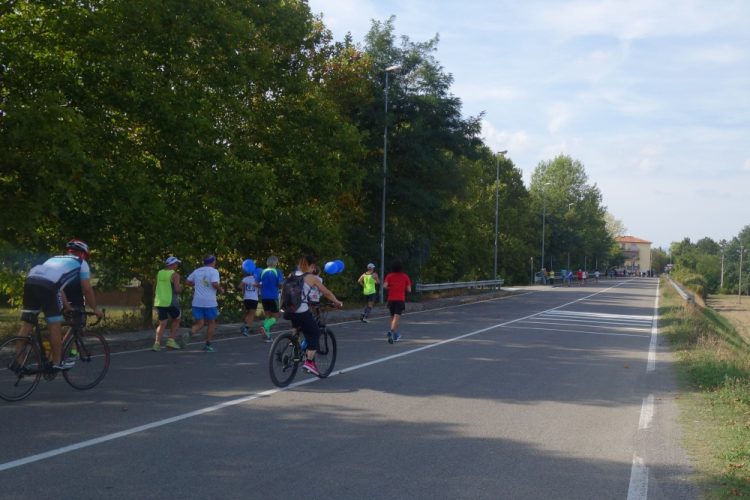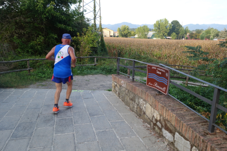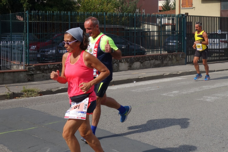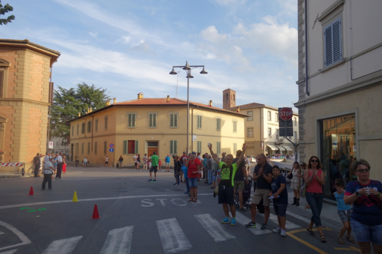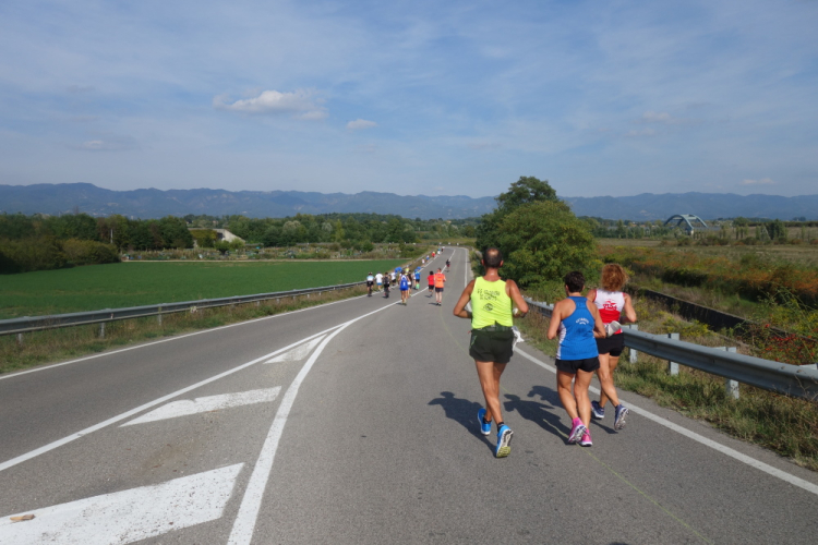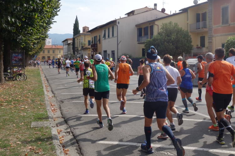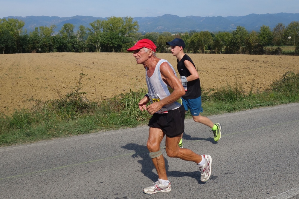 Ein Läufer mit einem Shirt vom Rursee-Marathon fällt mir auf. Es ist Wolfgang und auch er leidet unter der Hitze. Gut, dass es jetzt einige Zeit abwärts geht. Wir laufen nach Borgo San Lorenzo und umlaufen die bekannte Pizza Dante. Die 30er werden links ins Ziel gewunken und die Marathonis dürfen geradeaus auf eine weitere Schleife.