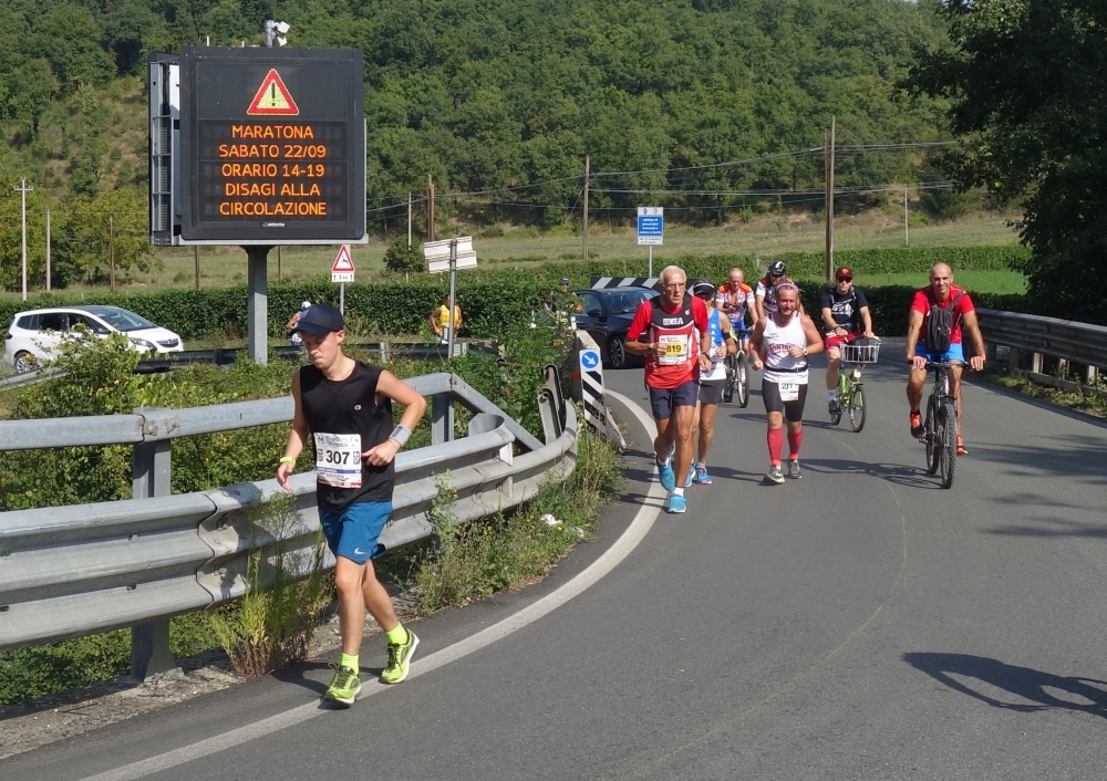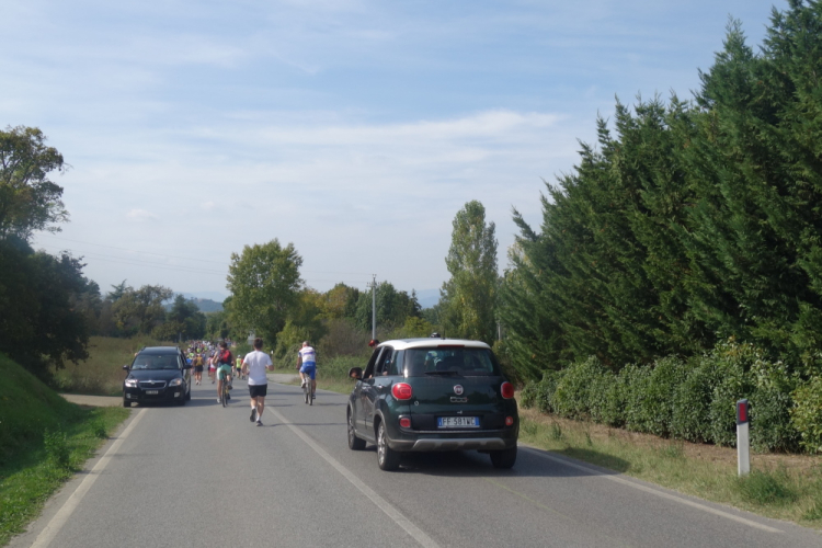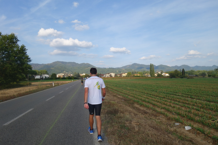 Es ist schon eine Herausforderung, trotz der Hitze und den zum Teil langen Geraden im Laufschritt zu bleiben. Viele Läufer gehen schon. Luco di Mugello wird durchlaufen und eine weitere VS bietet Labung. Ich greife gerne bei den Marmeladenbroten zu.