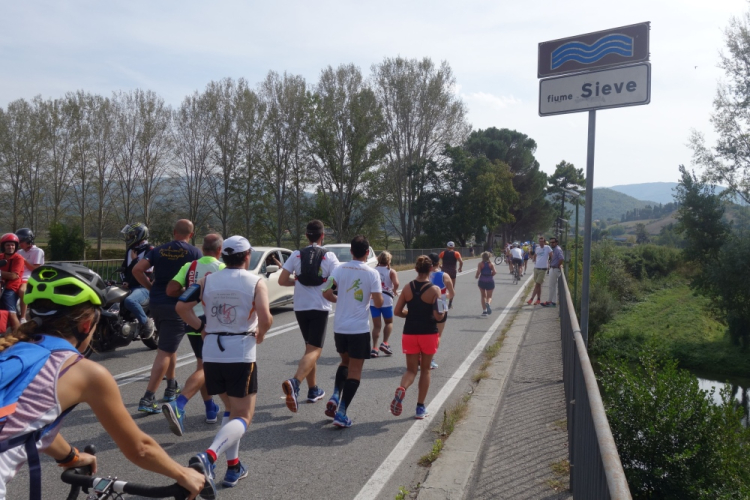 Endlich ist der Wendepunkt auch für mich da und ich mache mich auf den Rückweg. Die Steigungen gehe ich, alles andere wird langsam gelaufen. So kämpfe ich mich nach Borgo San Lorenzo zurück. Gut, dass es an den VS jetzt auch Cola zu trinken gibt. Eine lange gerade Strecke vor der Stadt ist in der einsetzenden Dämmerung nochmals eine mentale Herausforderung. Ein letztes Mal noch über die Sieve und vorbei an der Porta Fiorentina komme ich an das Ziel an der Piazza Dante.